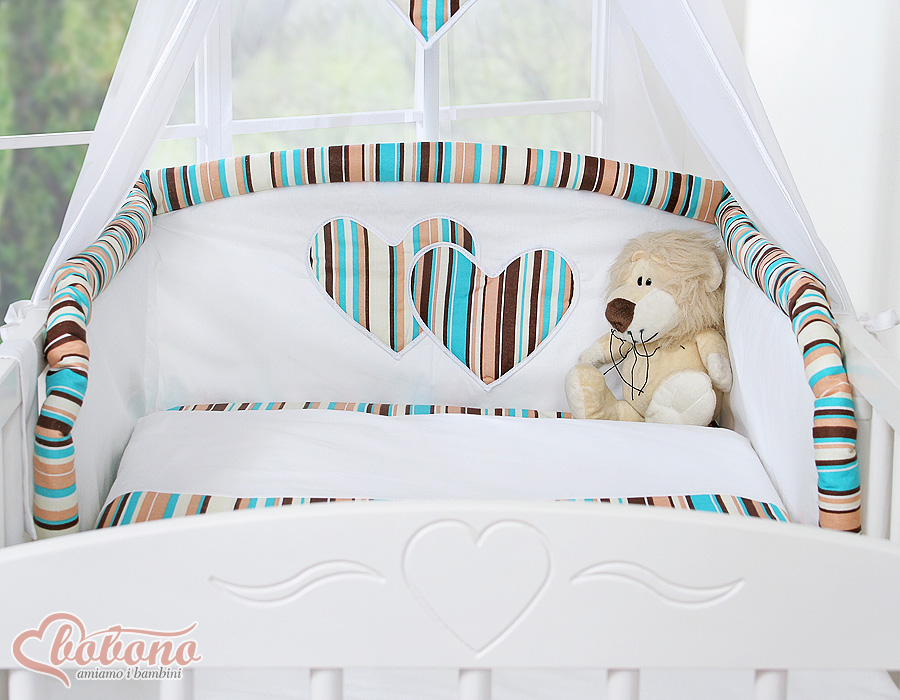Mitat: Pituus 188cm, korkeus 35cm. Muotoon ommeltu. Sopii pinnasängyille (60x120cm ja 70x140cm). Pääosa kevyesti kaarrettu ja koristeltu tikatuilla sydämillä, muotoon ommeltu kauniilla satiinireunuksella. Erityinen muotoilu, vahvistettu ja paksunnettu yläreuna lisää pinnasänkyyn pehmeyttä ja turvallisuutta.