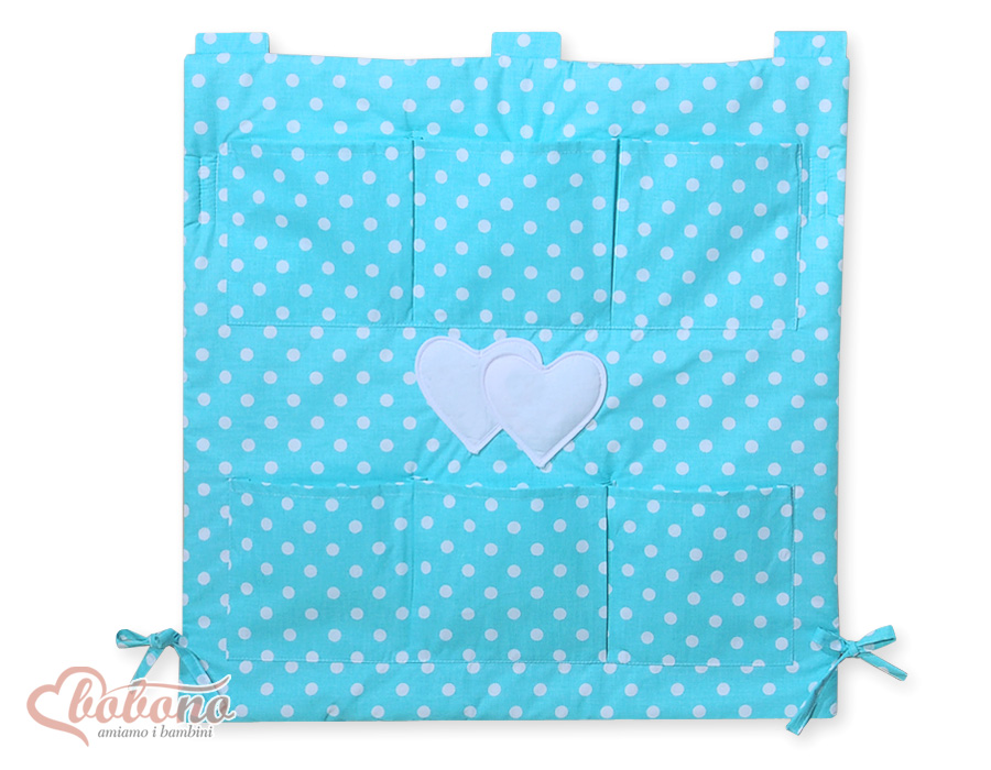 Etusivu » Vuodevaatesetit pinnasänkyyn » Vuodevaatesetit Sydämet » Pinnasängyn lokerikko » Säilytyslokerikko vauvan sänkyyn - Leijuvat sydämet Turkoosi Valkoisilla Pilkuilla