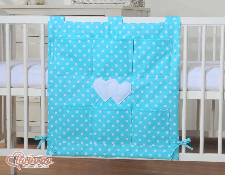 Säilytyslokerikko vauvan sänkyyn - Leijuvat sydämet Turkoosi Valkoisilla PilkuillaSäilytyslokerikko vauvan sänkyyn - Leijuvat sydämet Turkoosi Valkoisilla Pilkuilla