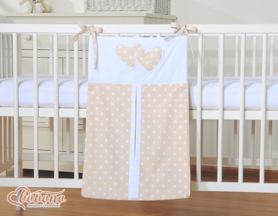 Etusivu » Vuodevaatesetit pinnasänkyyn » Vuodevaatesetit Sydämet » Vaippapussi » Säilytyspussi vaipoille - Hanging Hearts Beige Valkoisilla Pilkuilla
