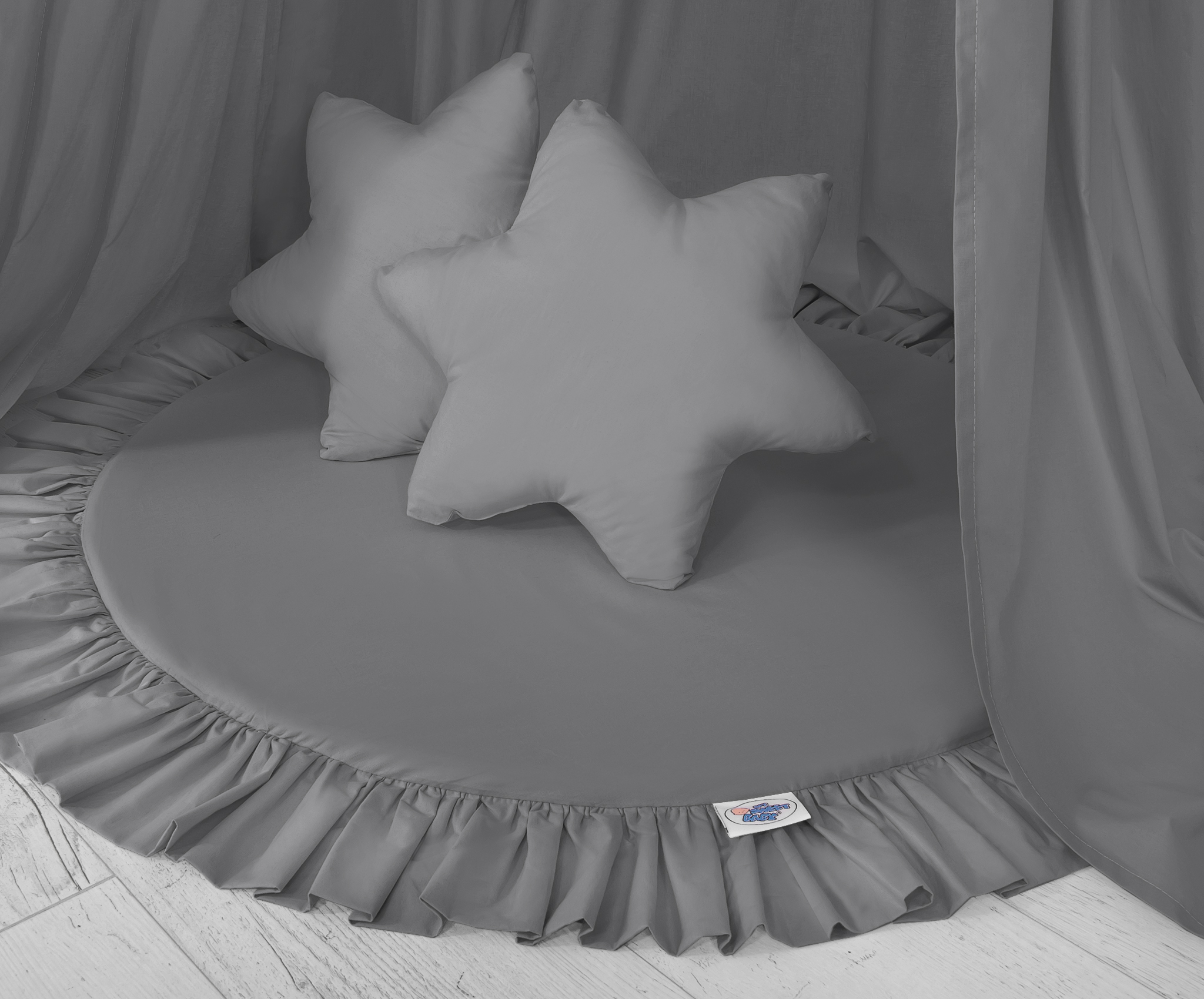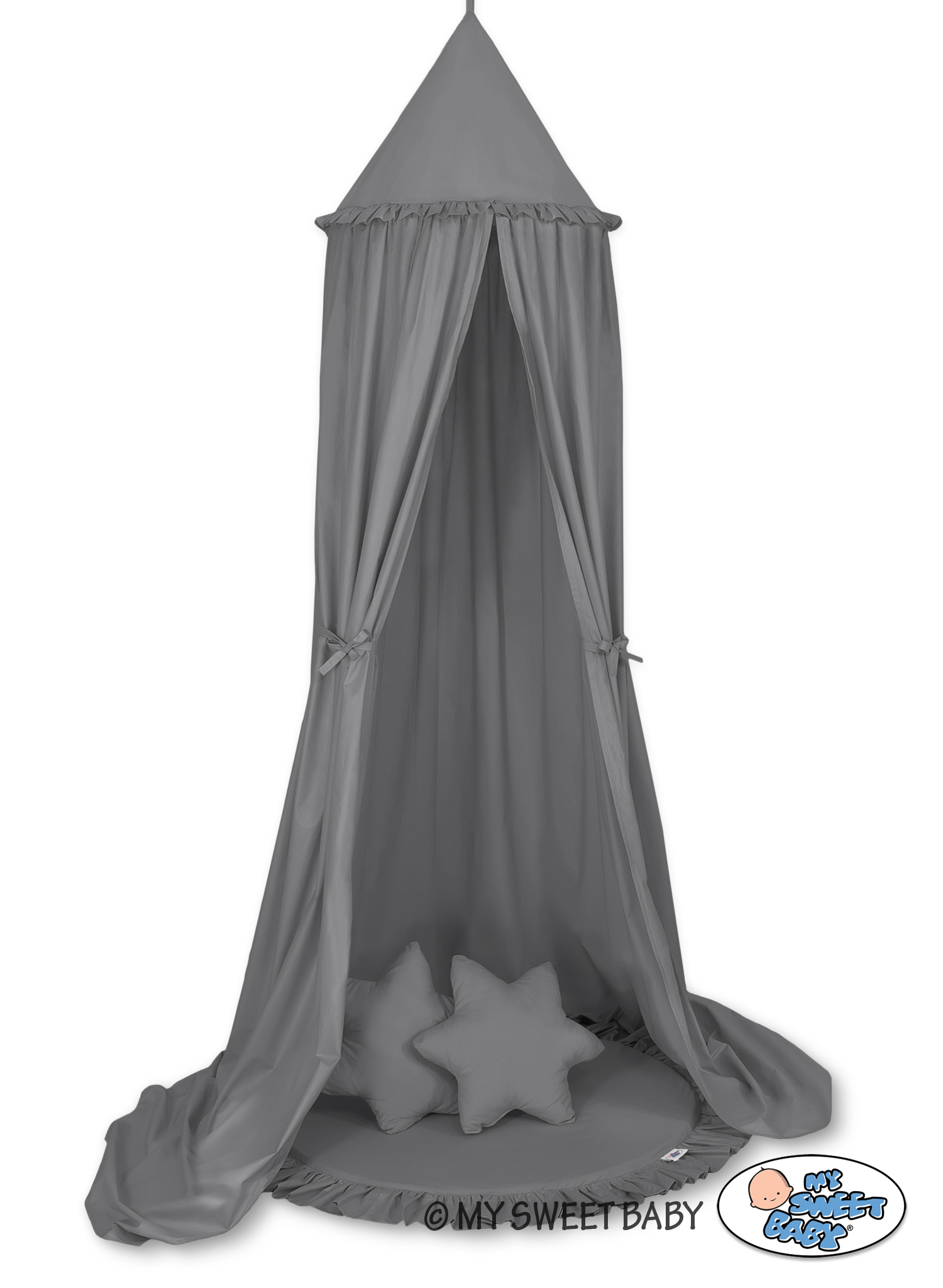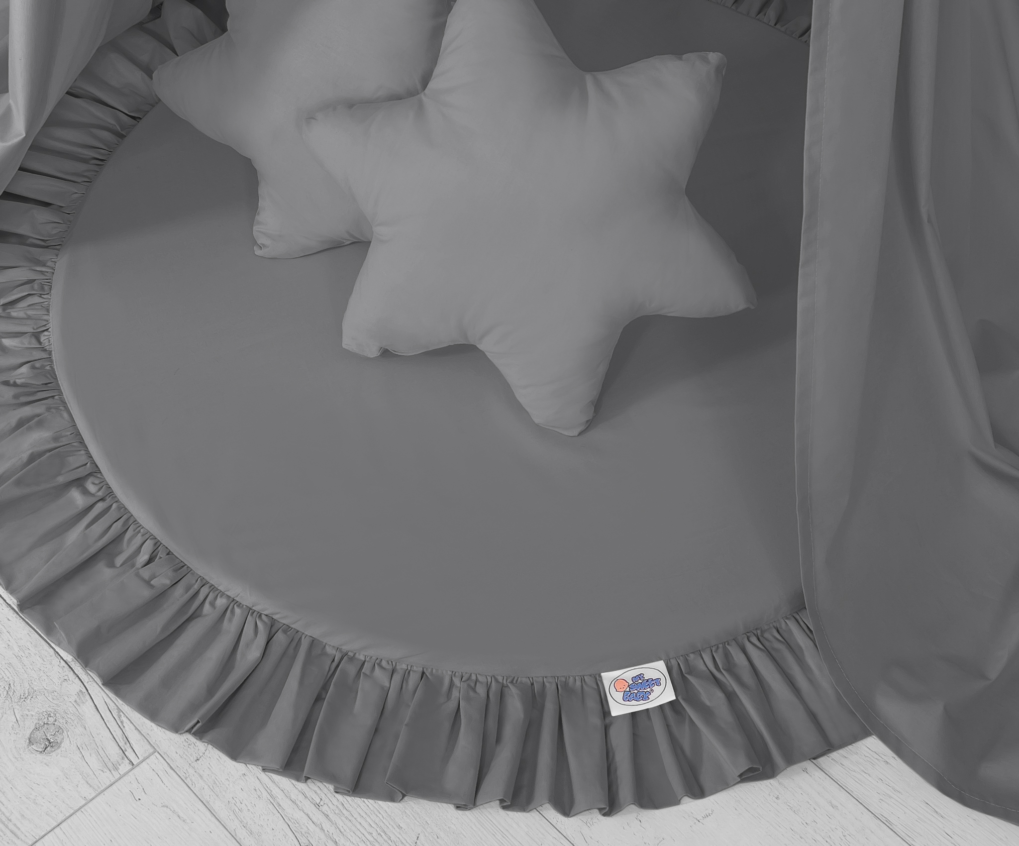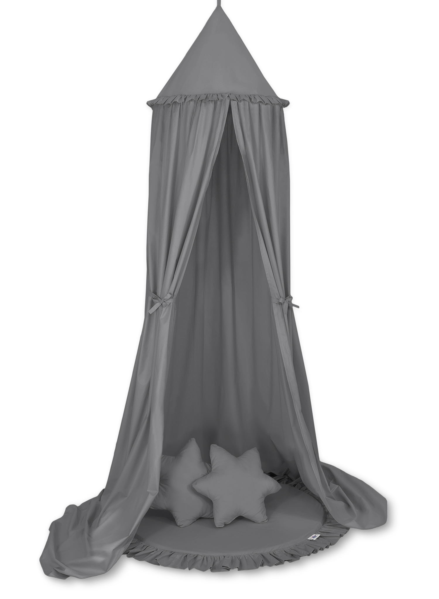 Etusivu » Vuodekatos » Setti: Vuodekatos + leikkimatto + tyynyt » Setti: Prinsessakatos + leikkimatto röyhelöreunuksella + tyynyt Antrasiitti
