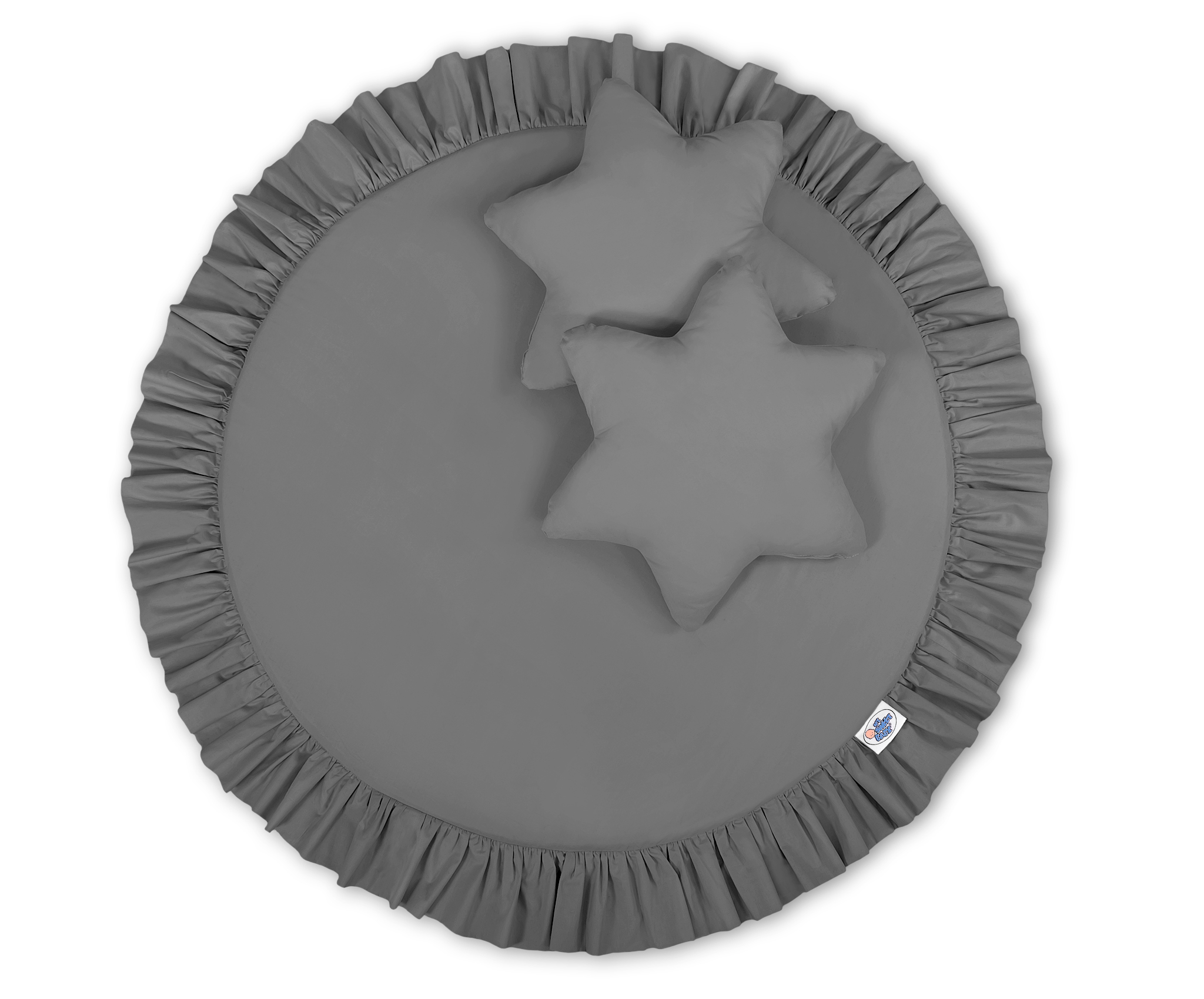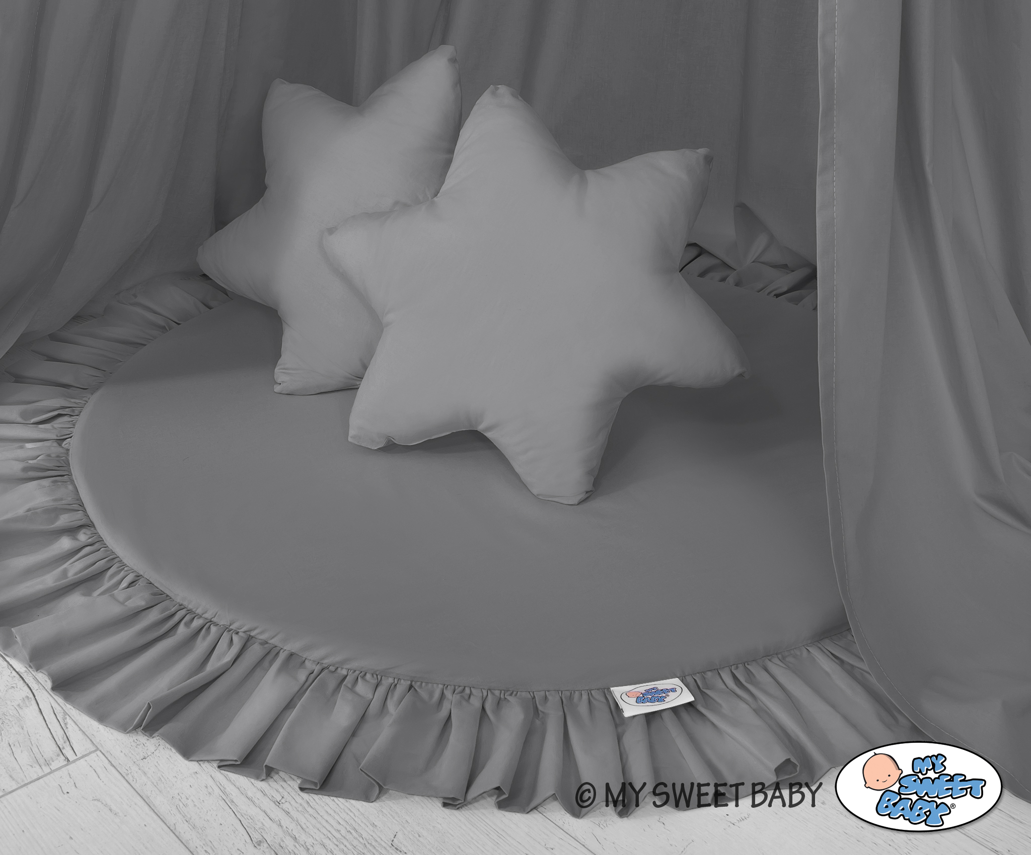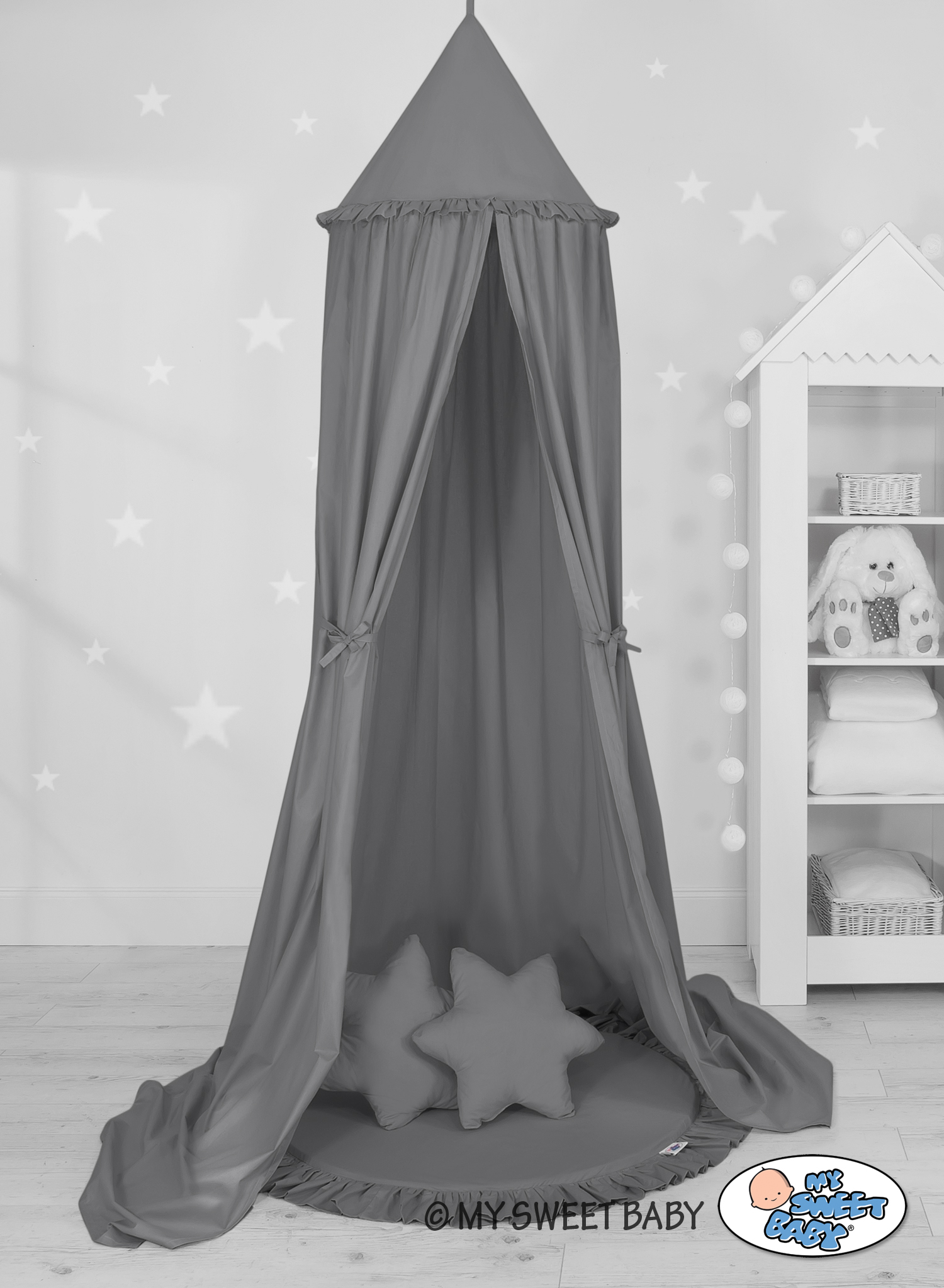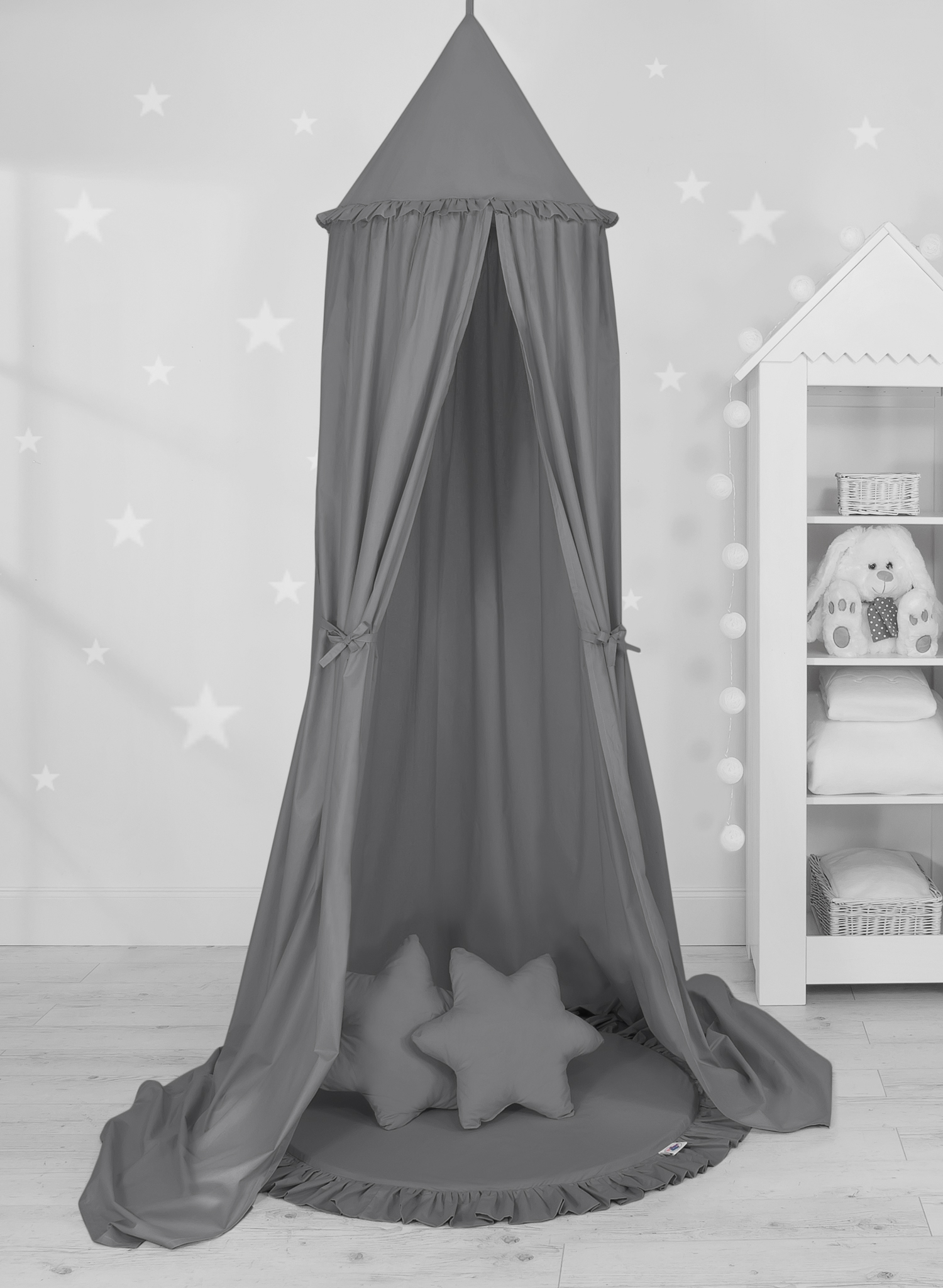 Etusivu » Vuodekatos » Setti: Vuodekatos + leikkimatto + tyynyt » Setti: Prinsessakatos + leikkimatto röyhelöreunuksella + tyynyt Antrasiitti