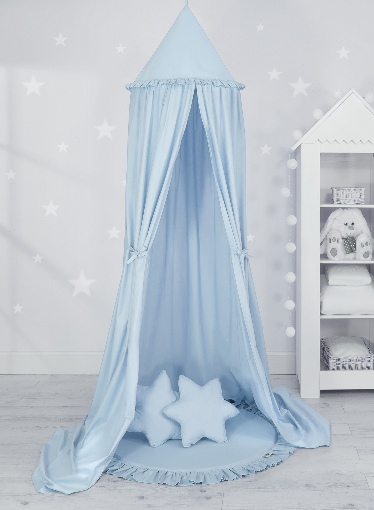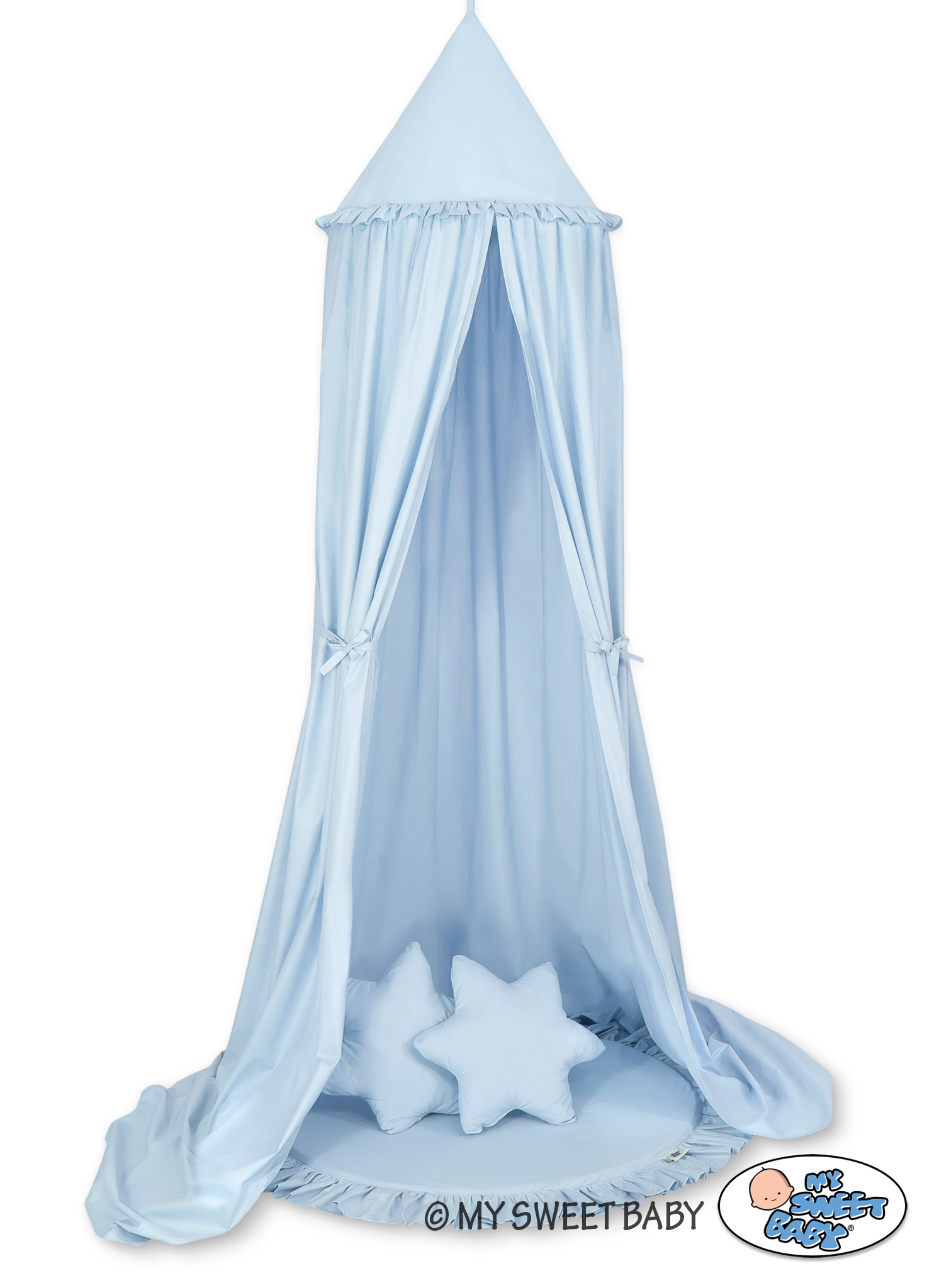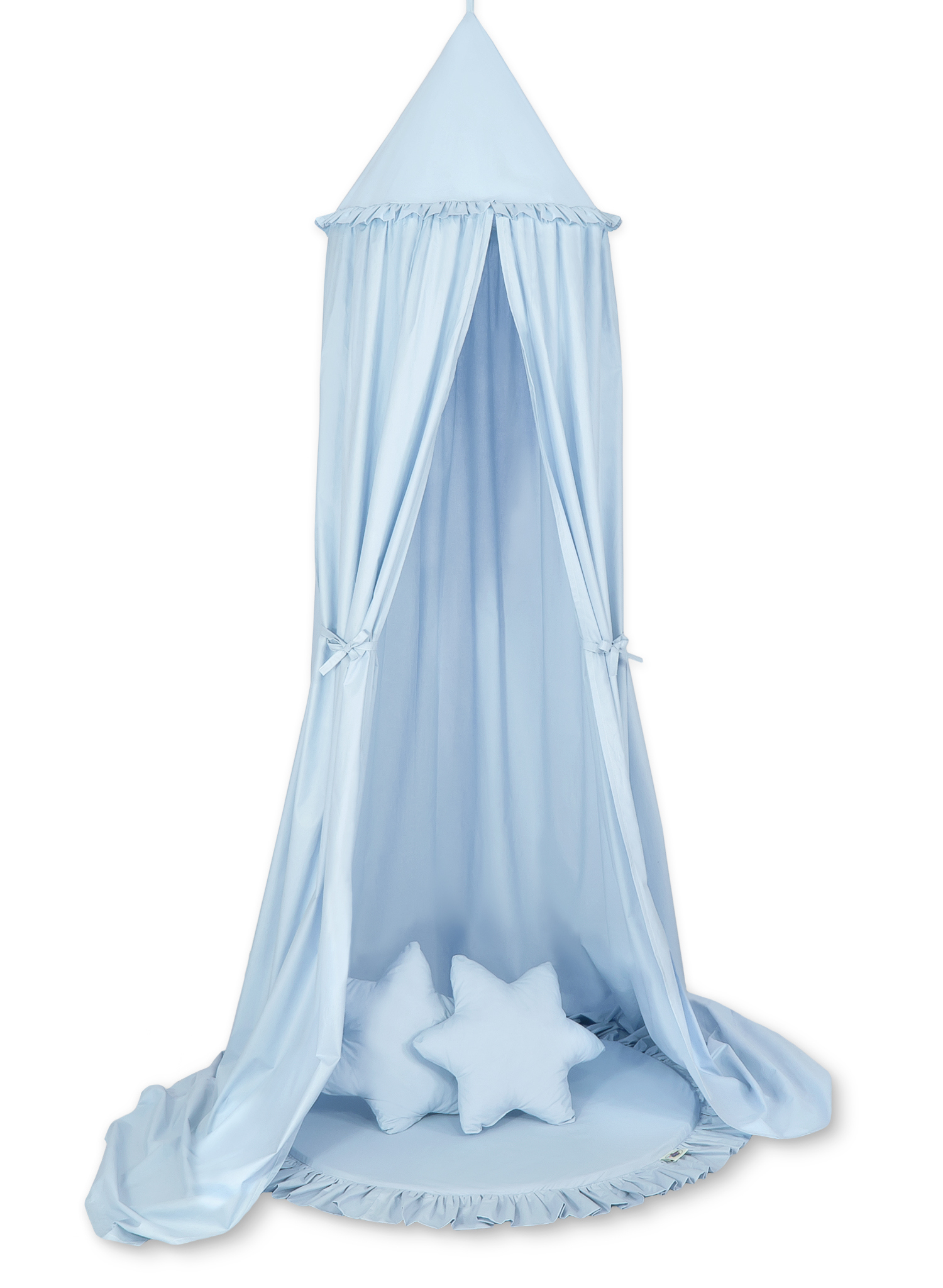 Etusivu » Vuodekatos » Setti: Vuodekatos + leikkimatto + tyynyt » Setti: Prinsessakatos + leikkimatto röyhelöreunuksella + tyynyt Sininen