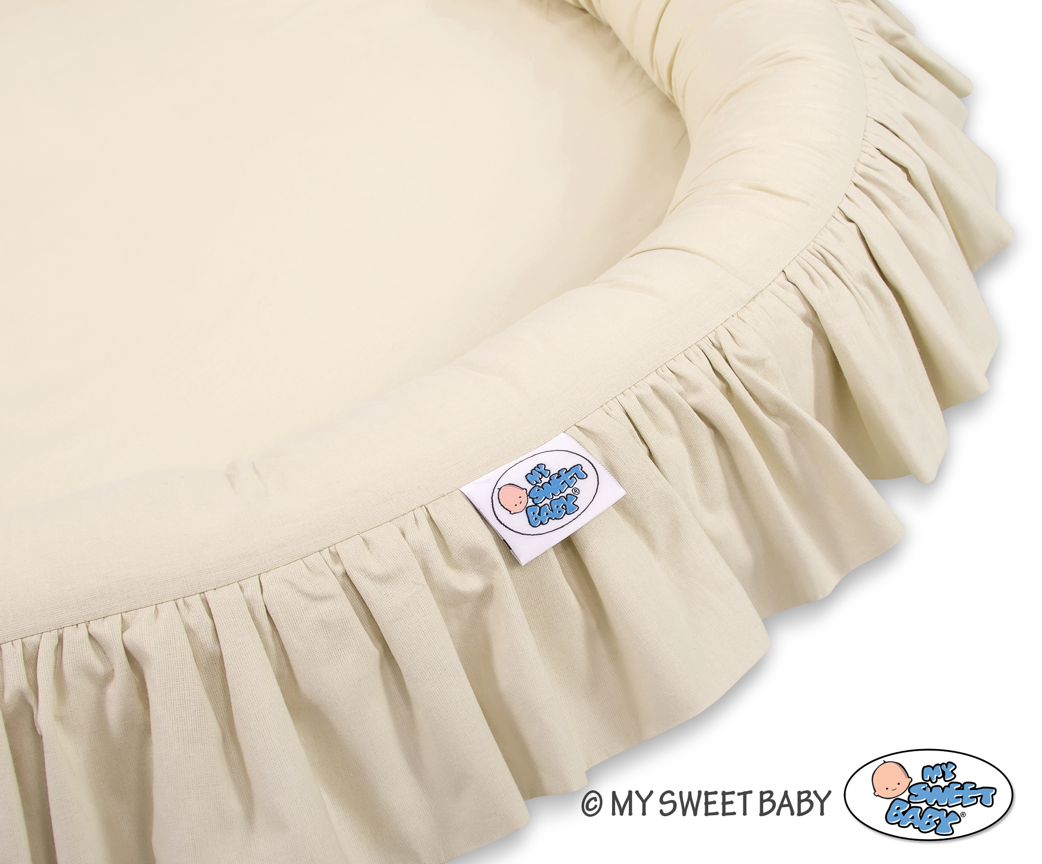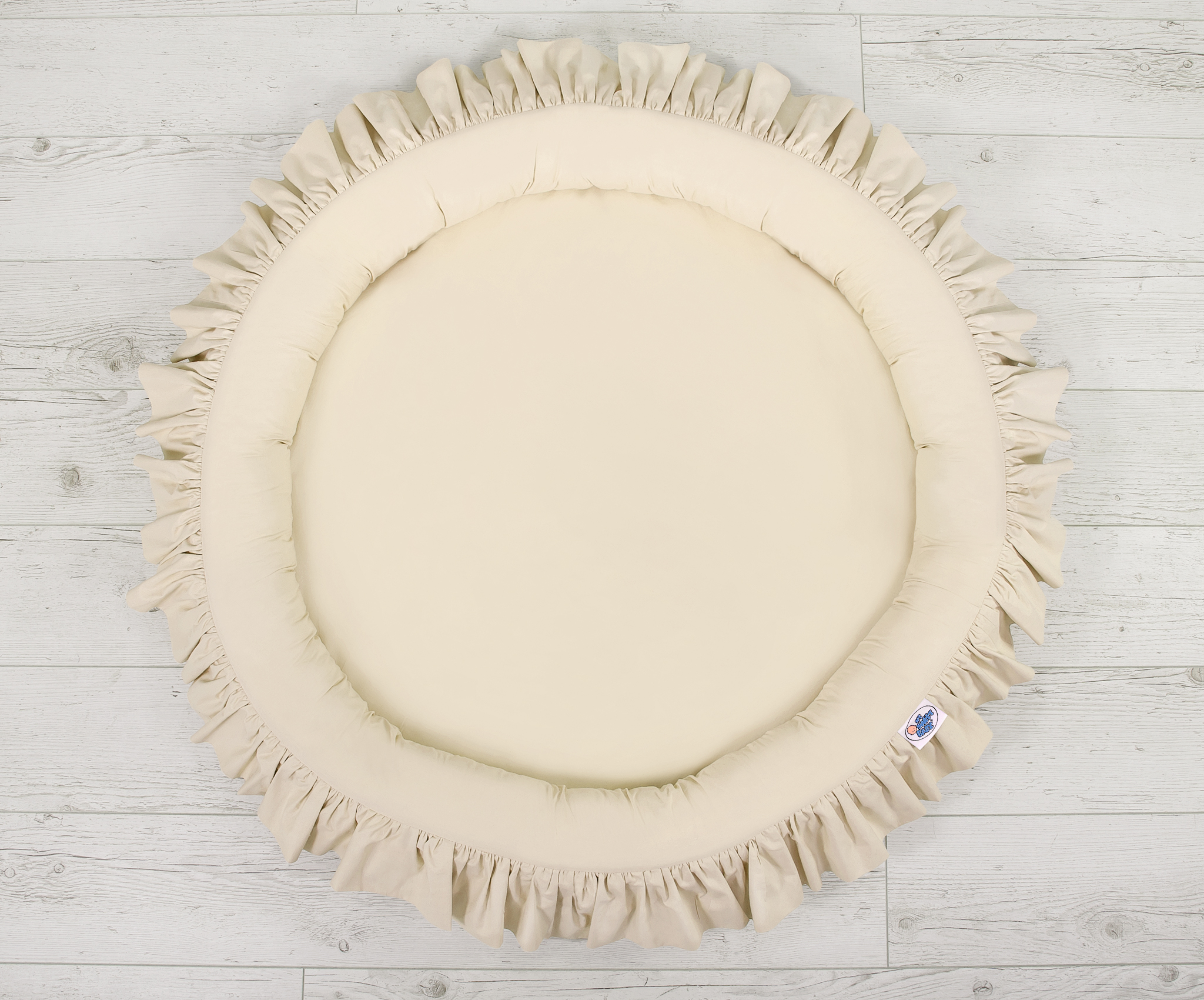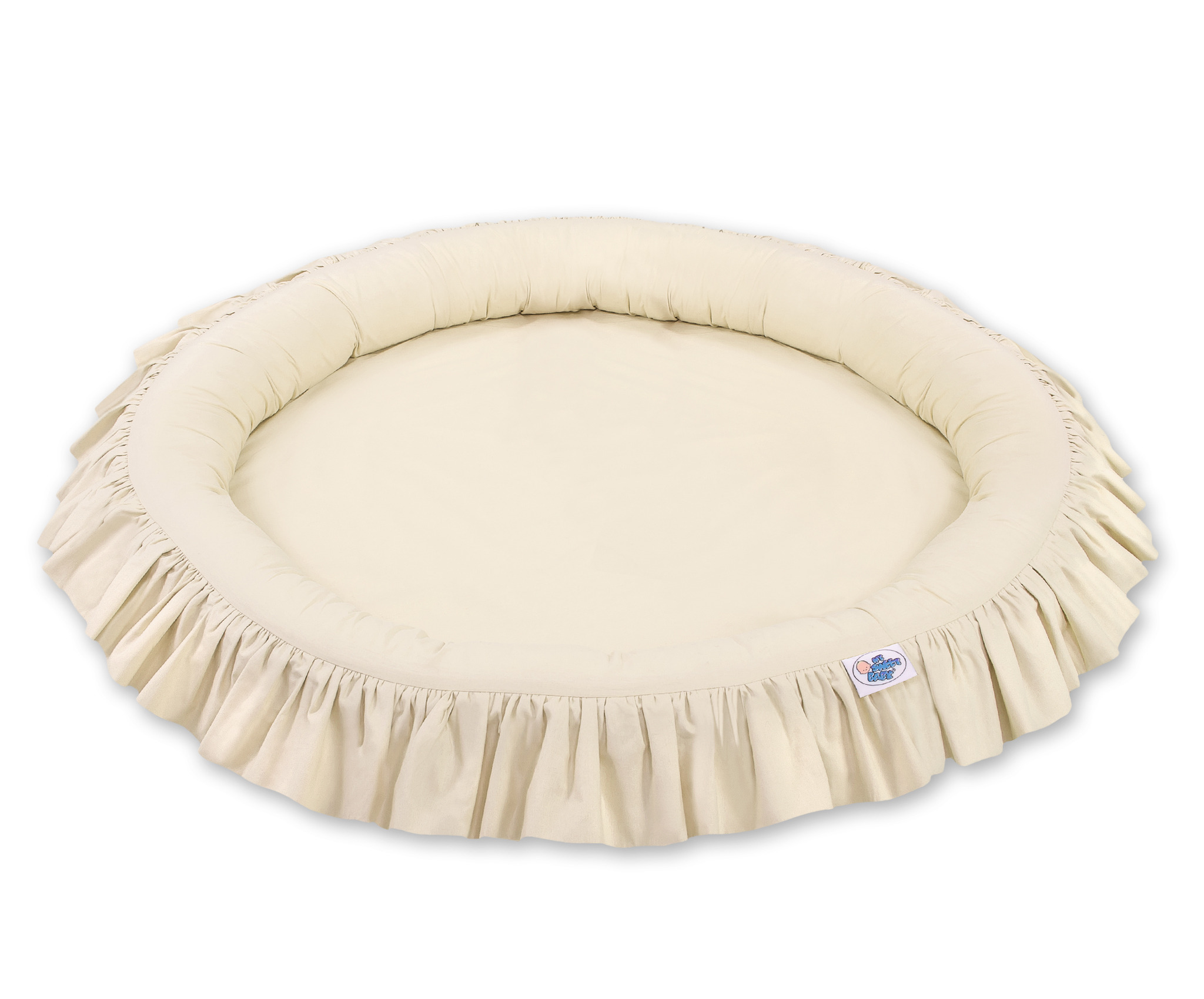 Ihana pesä röyhelöreunuksella. Käytännöllinen ja mukava leikkipesä. Pesämainen muoto sopii loistavasti lepäämiseen, leikkialustaksi vauvalle tai prinsessakatoksen alustaksi. Röyhelöreunuksinen pesä sopii vauvalle tämän ensihetkistä lähtien, aluksi turvallisena lepopaikkana ja unipesänä. Pehmeä reunus pitää vauvan turvallisesti reunojen sisäpuolella. Sopii moitteetta myös leikkialustaksi. Prinsessakatokseen yhdistettynä matto luo ihanan ja pehmeän alustan vaikka piilopaikaksi.