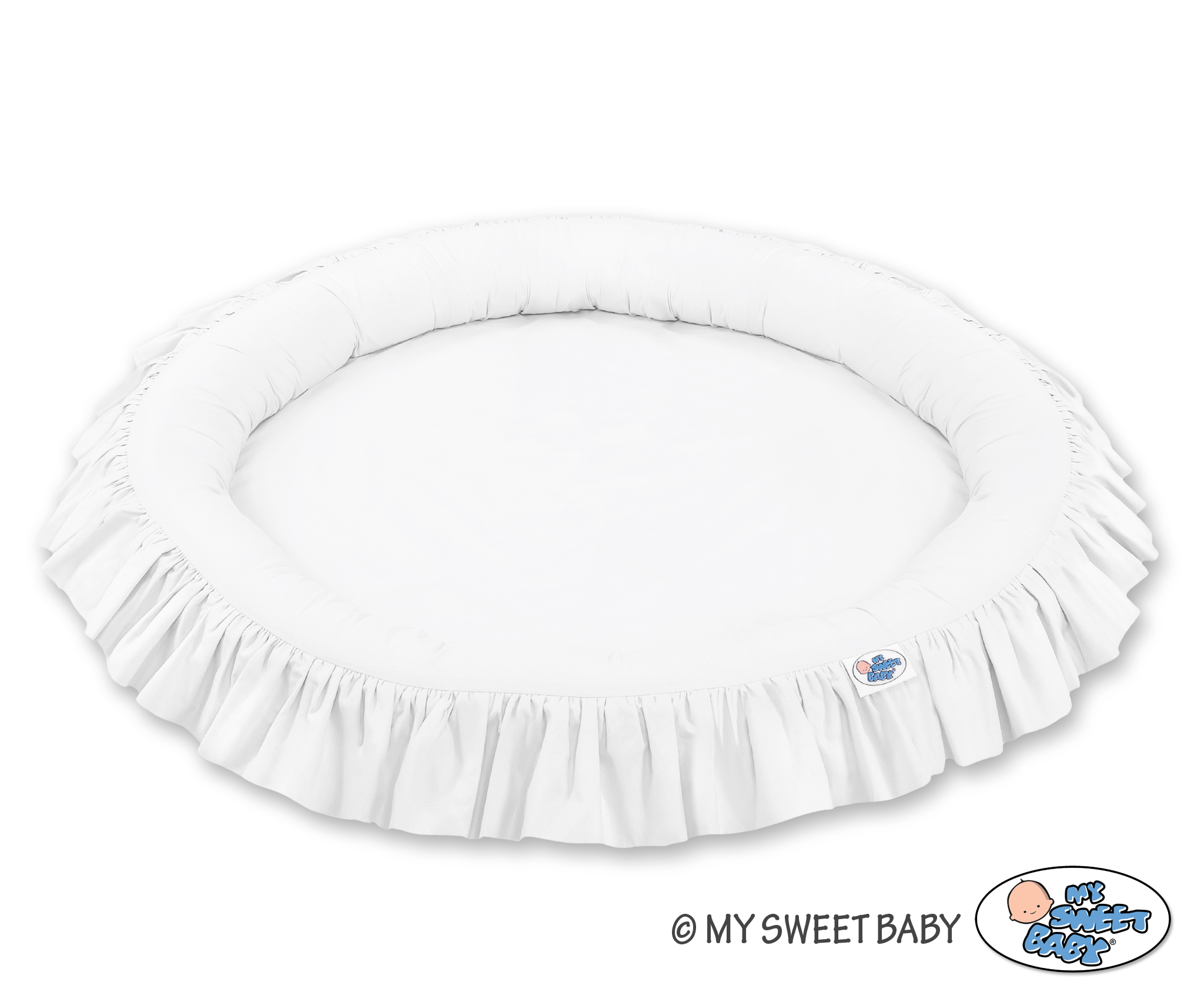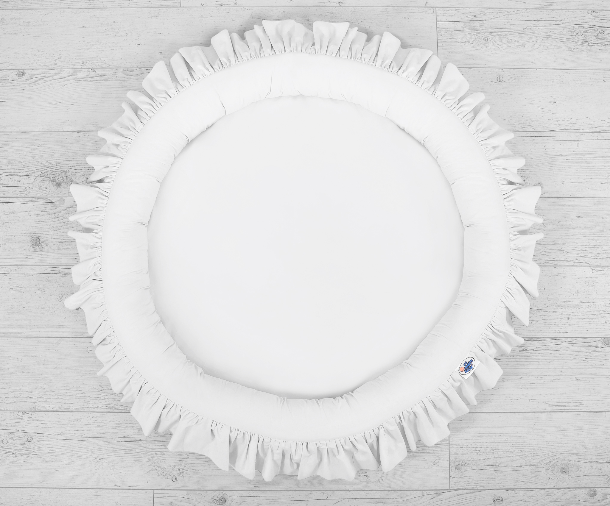 Ihana pesä röyhelöreunuksella. Käytännöllinen ja mukava leikkipesä. Pesämainen muoto sopii loistavasti lepäämiseen, leikkialustaksi vauvalle tai prinsessakatoksen alustaksi. Röyhelöreunuksinen pesä sopii vauvalle tämän ensihetkistä lähtien, aluksi turvallisena lepopaikkana ja unipesänä. Pehmeä reunus pitää vauvan turvallisesti reunojen sisäpuolella. Sopii moitteetta myös leikkialustaksi. Prinsessakatokseen yhdistettynä matto luo ihanan ja pehmeän alustan vaikka piilopaikaksi.