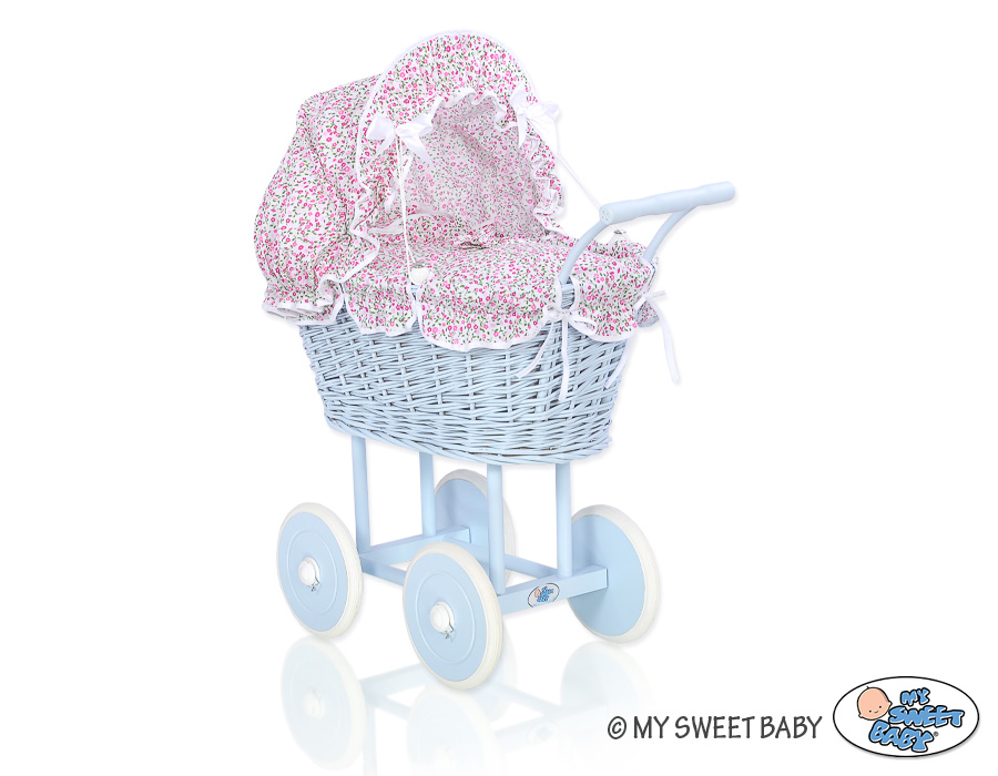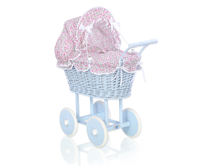 Etusivu » Lelut » Nukenvaunut » Punottu Nukenvaunut » Punottu Nukenvaunut Sininen » Sininen vaunu punotulla korilla nukelle Vaaleanpunainen Sininen Kukkaketo Kukat