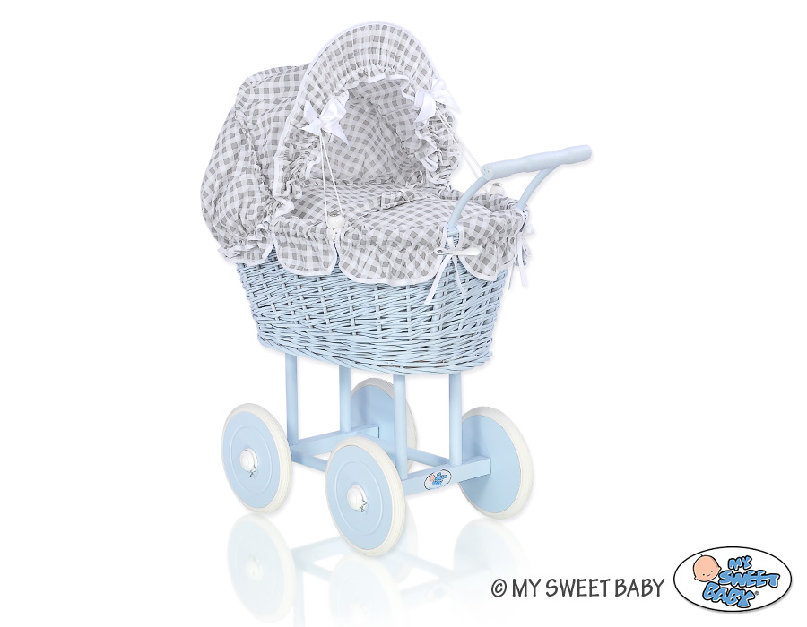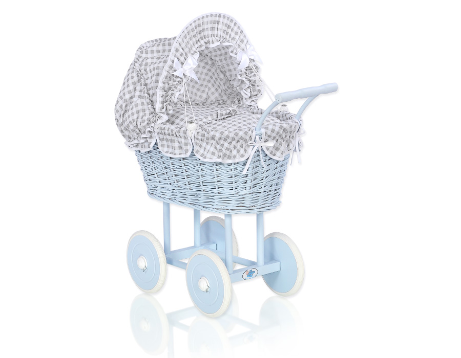 Siniset nuken vaunu punotulla korilla ja pehmusteilla Harmaa Sininen Ruutukuvio