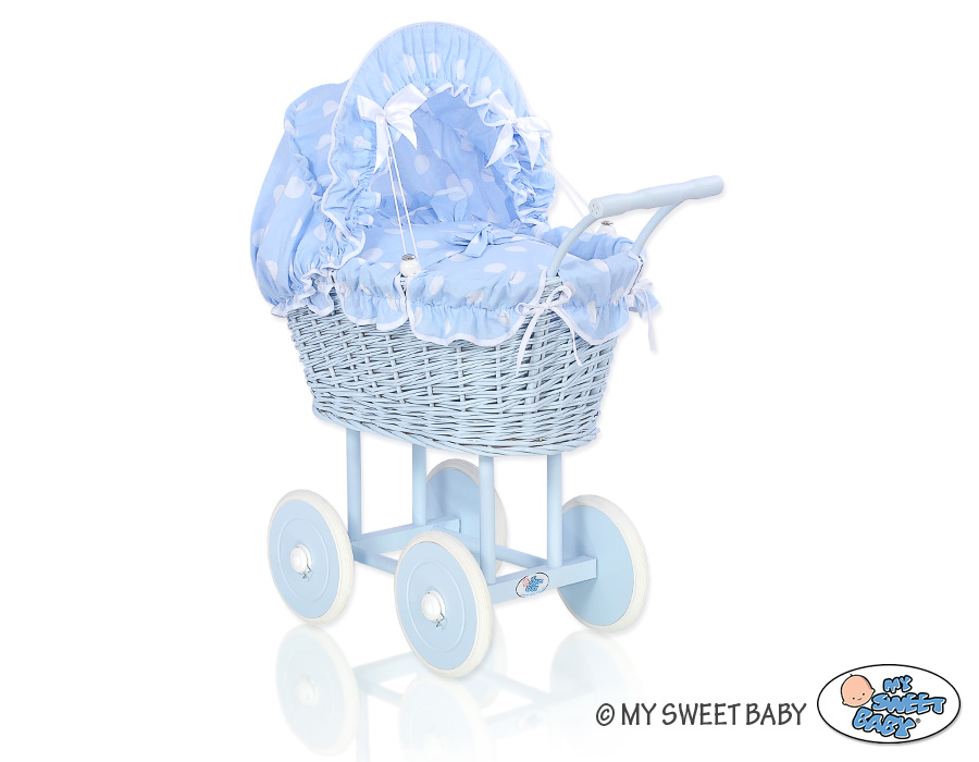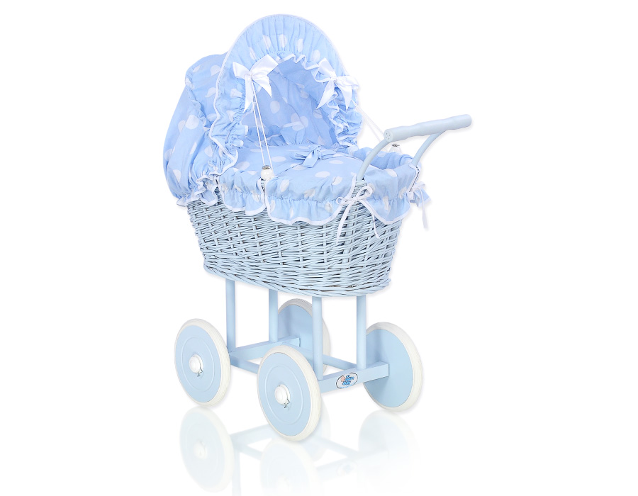 Etusivu » Lelut » Nukenvaunut » Punottu Nukenvaunut » Punottu Nukenvaunut Sininen » Siniset nuken vaunu punotulla korilla ja pehmusteilla Sininen