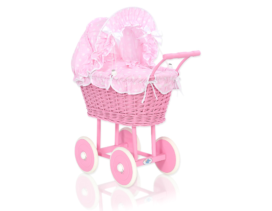 Tumma pinkki punottu nuken vaunu korikehdolla Vaaleanpunainen