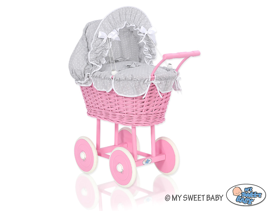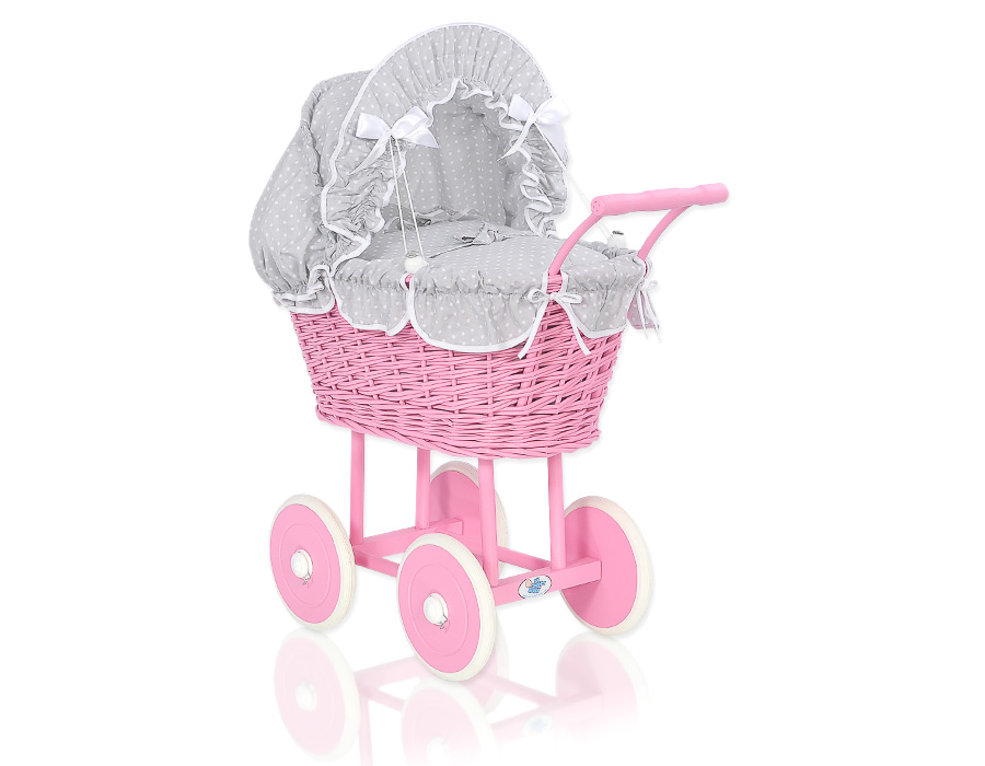 Tumma Vaaleanpunainen nuken vaunu punotulla korilla ja pehmusteilla Valkoinen Harmaa Valkoisilla PilkuillaTumma Vaaleanpunainen nuken vaunu punotulla korilla ja pehmusteilla Valkoinen Harmaa Valkoisilla PilkuillaTumma Vaaleanpunainen nuken vaunu punotulla korilla ja pehmusteilla Valkoinen Harmaa Valkoisilla Pilkuilla