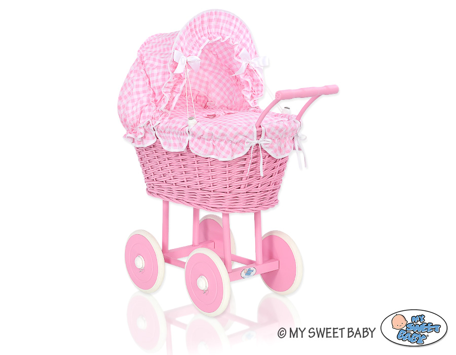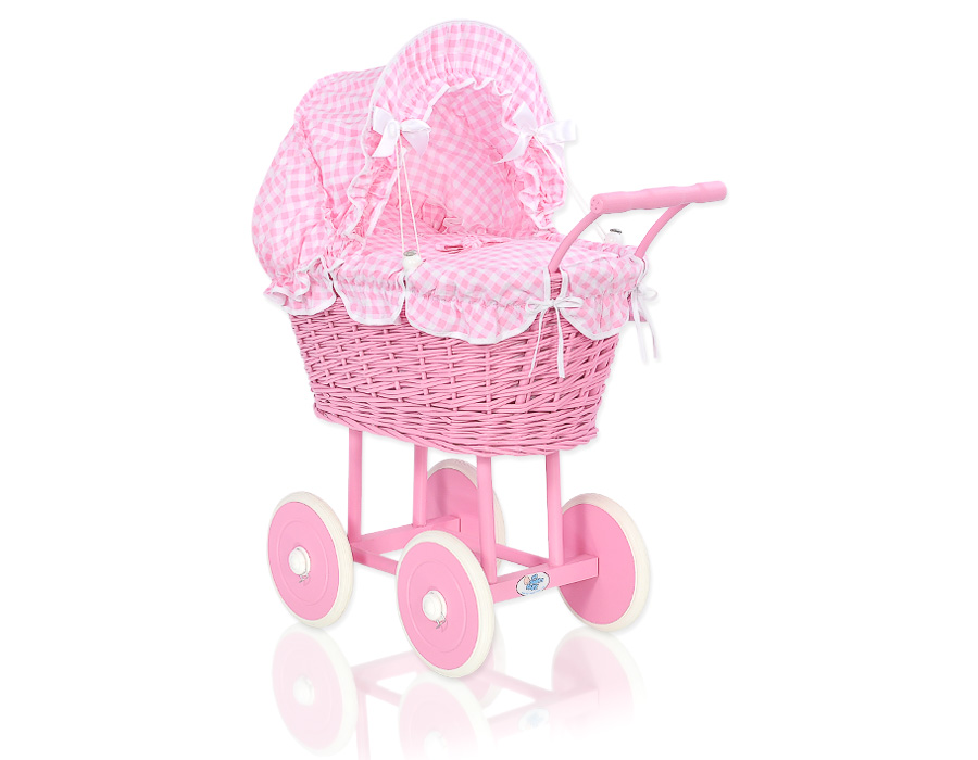 Tumma Vaaleanpunainen vaunu punotulla korilla nukelle, fuksia  Vaaleanpunainen Ruutukuvio