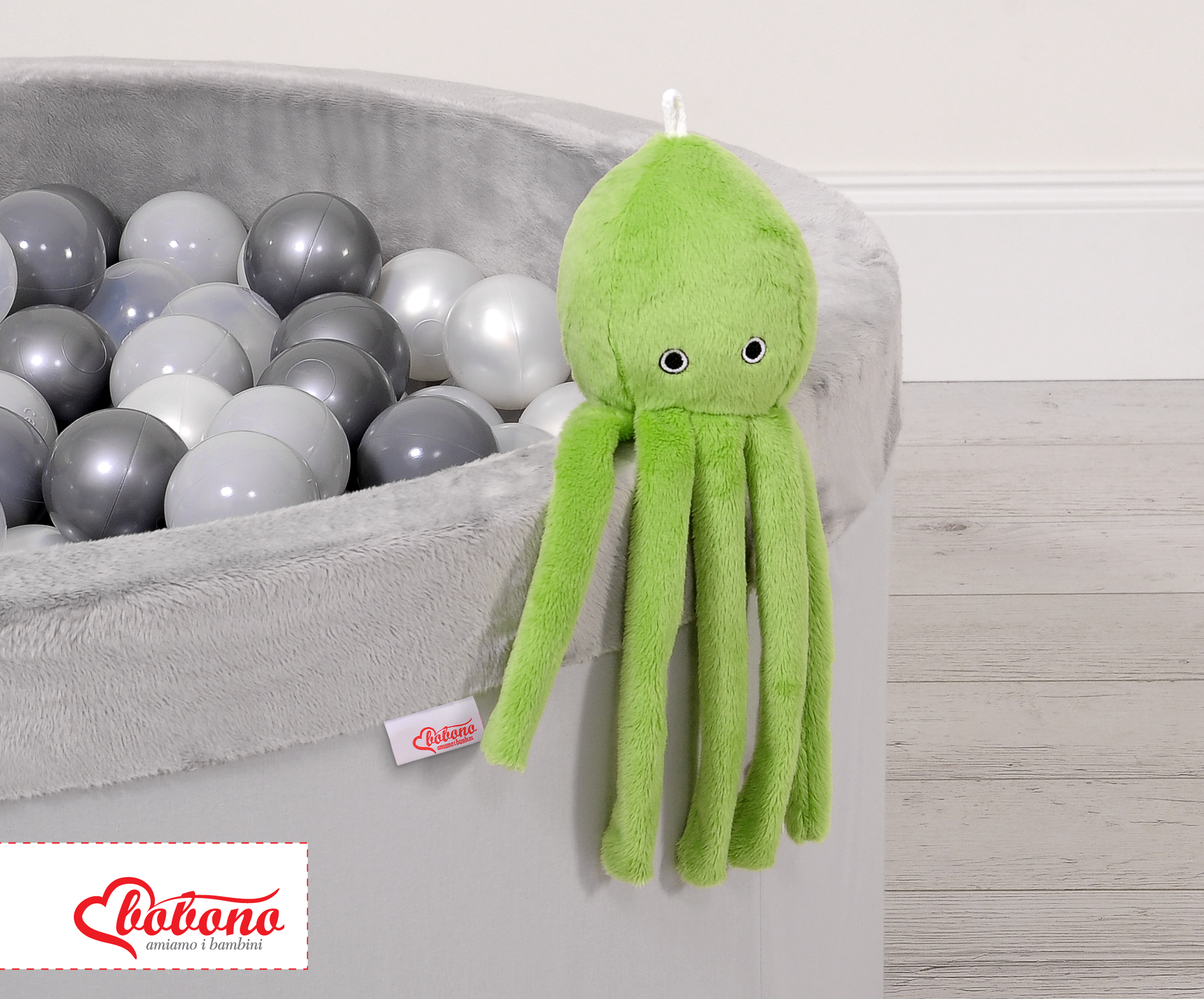 Tämä hupaisa ja halittava tyyny sopii kuin nakutettu jokaiselle vauvalle. Mustekalan lonkerot tuntuvat mukavilta vauvan pikkukätösissä. Tyyny on hauska ja turvallinen virike vauvan ensihetkistä lähtien. Hellä helistimen ääni kerää vauvan huomion itseensä. Pöyheä ja pehmeä tyyny on hellävaraista pörrö-fleeceä. Täyte on silikonista eko-palloa, eli kuin keinotekoista untuvaa. Muotoilu takaa vauvalle mukavan asettumisen sekä ilman kiertämisen.
