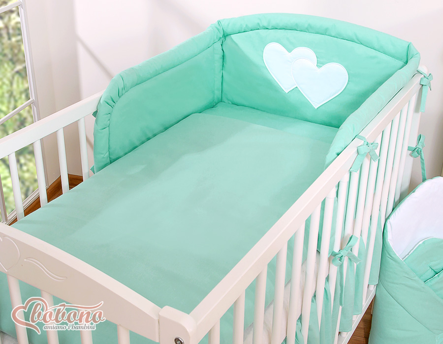 Etusivu » Vuodevaatesetit pinnasänkyyn » Vuodevaatesetit Sydämet » Vuodevaatesetit pinnasänkyyn 120cm Sydämet » Vauvan Sängyn Reunapehmuste » Universaali pinnasängyn reunapehmuste - Hanging Hearts Minttu
