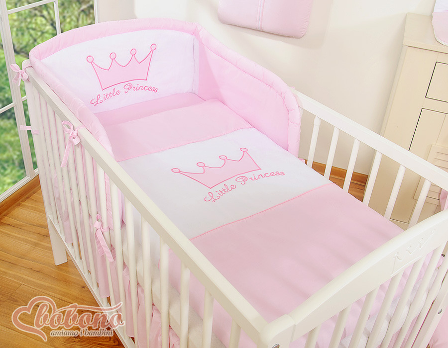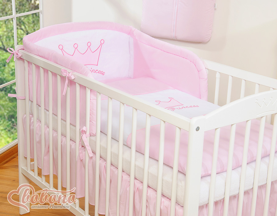 Mitat: Pituus 188cm, korkeus 35cm. Muotoon ommeltu. Sopii pinnasängyille (60x120cm ja 70x140cm). Pääosa kevyesti kaarrettu ja koristeltu tikatuilla kruunuilla ja tekstillä, muotoon ommeltu kauniilla satiinireunuksella. Erityinen muotoilu, vahvistettu ja paksunnettu yläreuna lisää pinnasänkyyn pehmeyttä ja turvallisuutta.