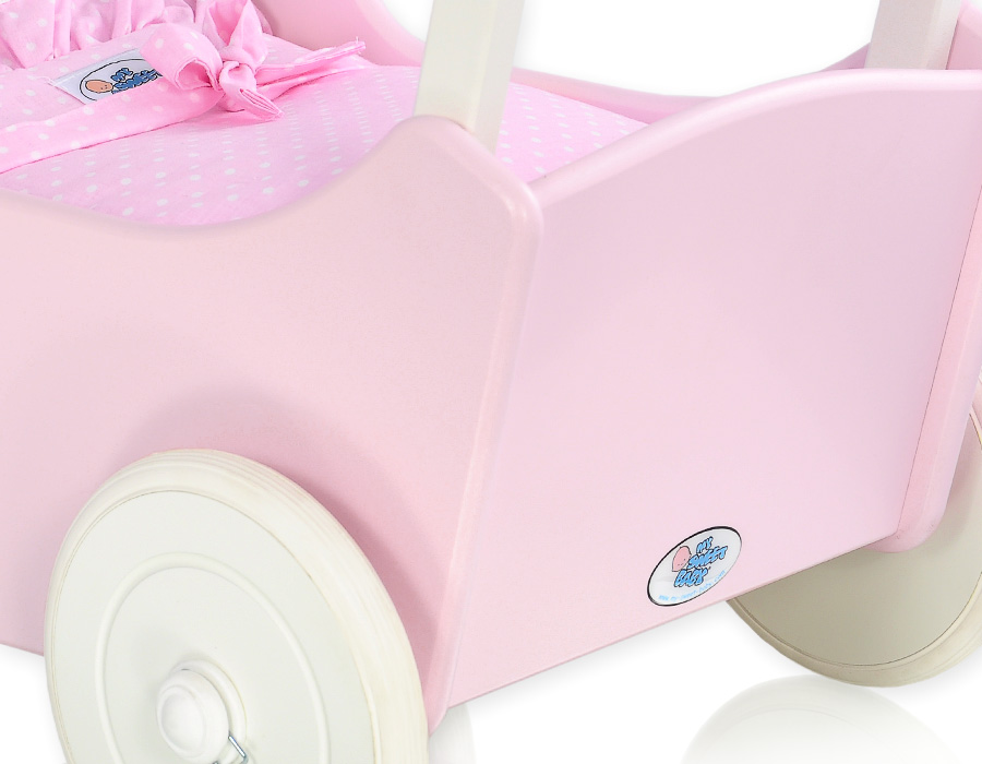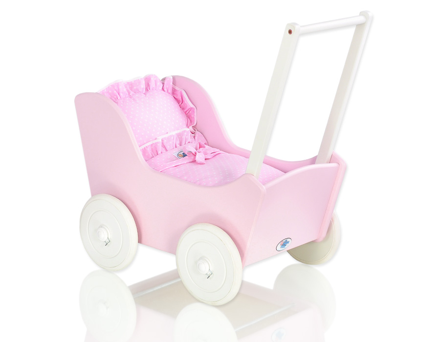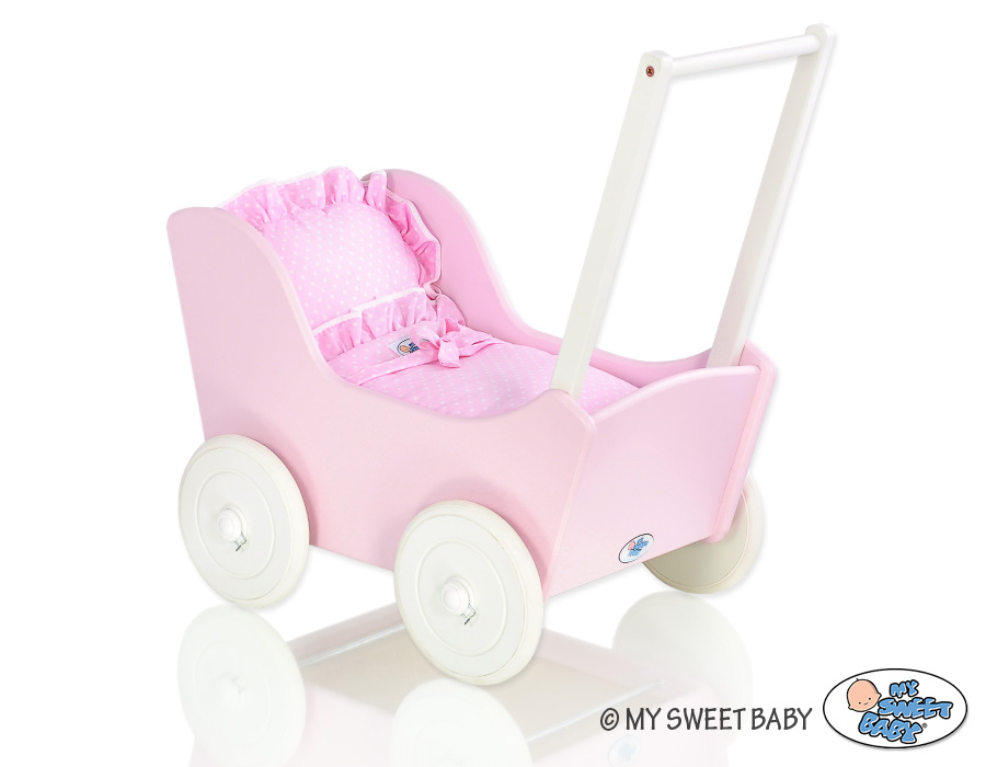Vaaleanpunainen Puinen nuken vaunu Vaaleanpunainen Valkoinen