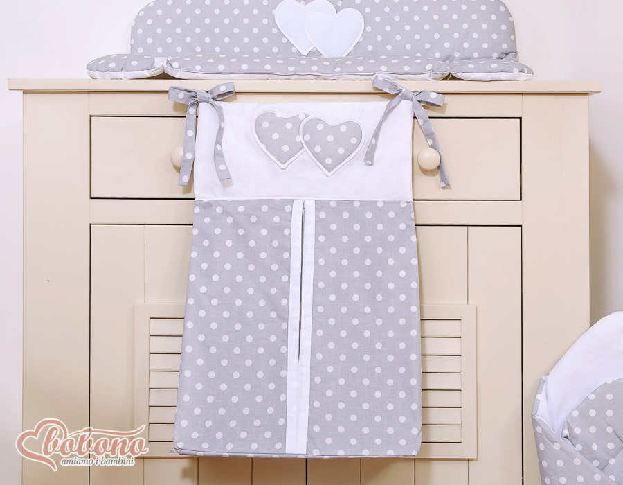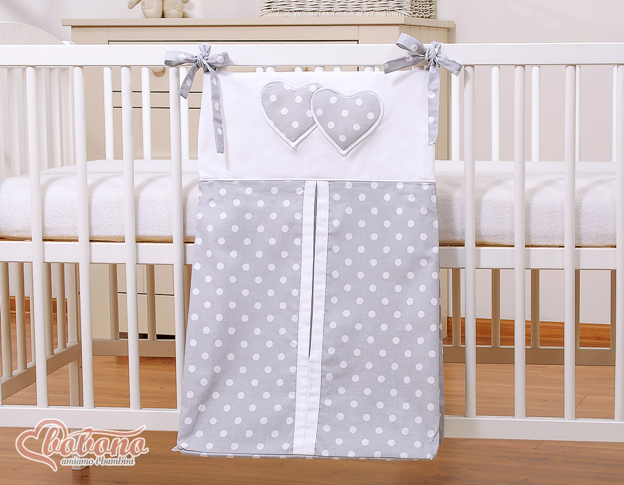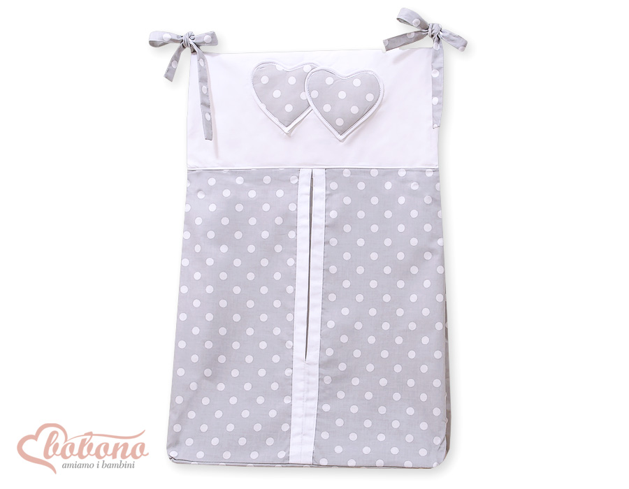 Etusivu » Vuodevaatesetit pinnasänkyyn » Vuodevaatesetit Sydämet » Vaippapussi » Vaippapussi - Hanging Hearts Harmaa Valkoisilla Pilkuilla