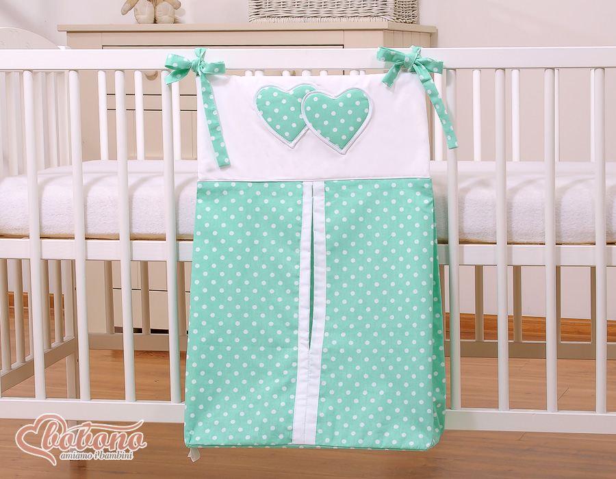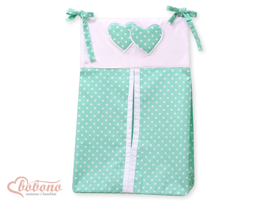 Etusivu » Vuodevaatesetit pinnasänkyyn » Vuodevaatesetit Sydämet » Vaippapussi » Vaippapussi - Hanging Hearts Minttu Valkoisilla Pilkuilla
