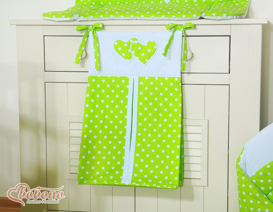 Etusivu » Vuodevaatesetit pinnasänkyyn » Vuodevaatesetit Sydämet » Vaippapussi » Vaippapussi - Leijuvat sydämet Vihreä Valkoisilla Pilkuilla