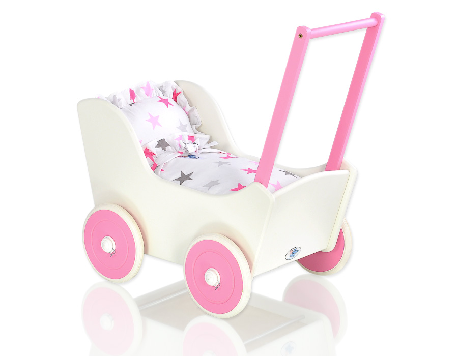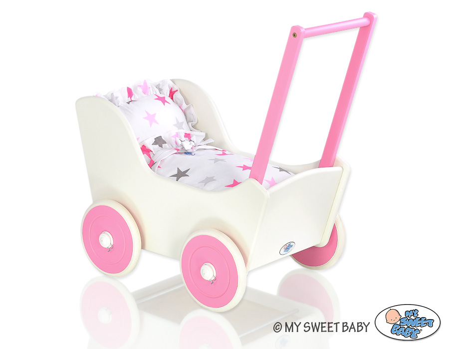 Valko-Tumma pinkki  Puinen nuken vaunu Valkoinen
