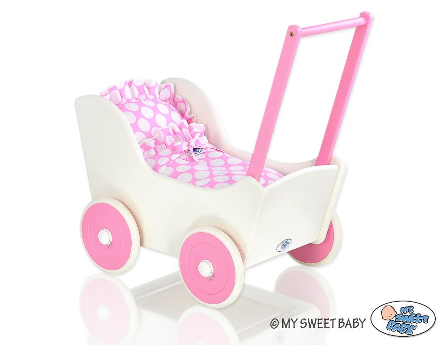 Valko-Tumma pinkki  Puinen nuken vaunu ValkoinenValko-Tumma pinkki  Puinen nuken vaunu Valkoinen
