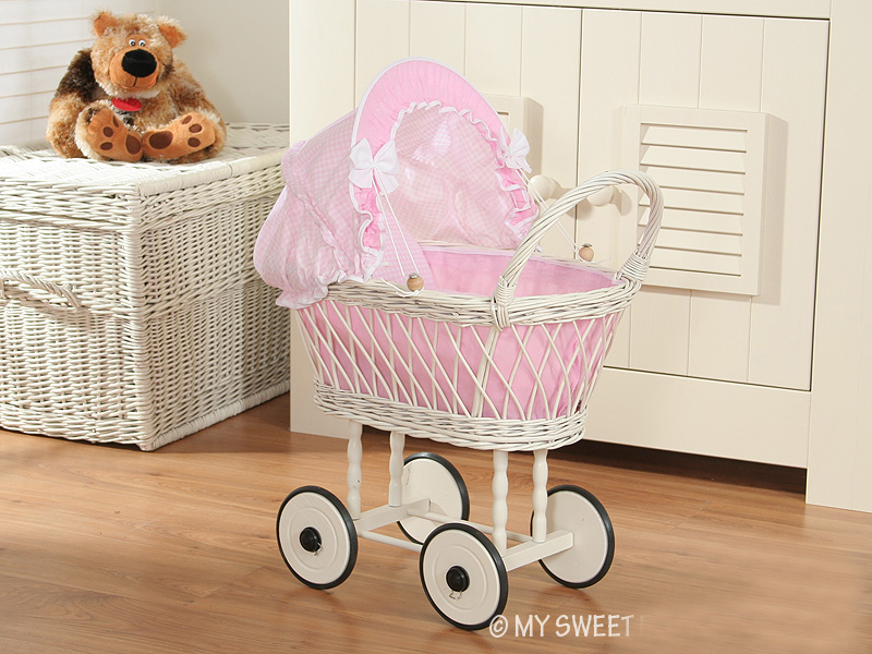 Etusivu » Lelut » Nukenvaunut » Punottu Nukenvaunut » Punottu Nukenvaunut Valkoinen » Valkoinen nuken vaunu punotulla korilla Valkoinen