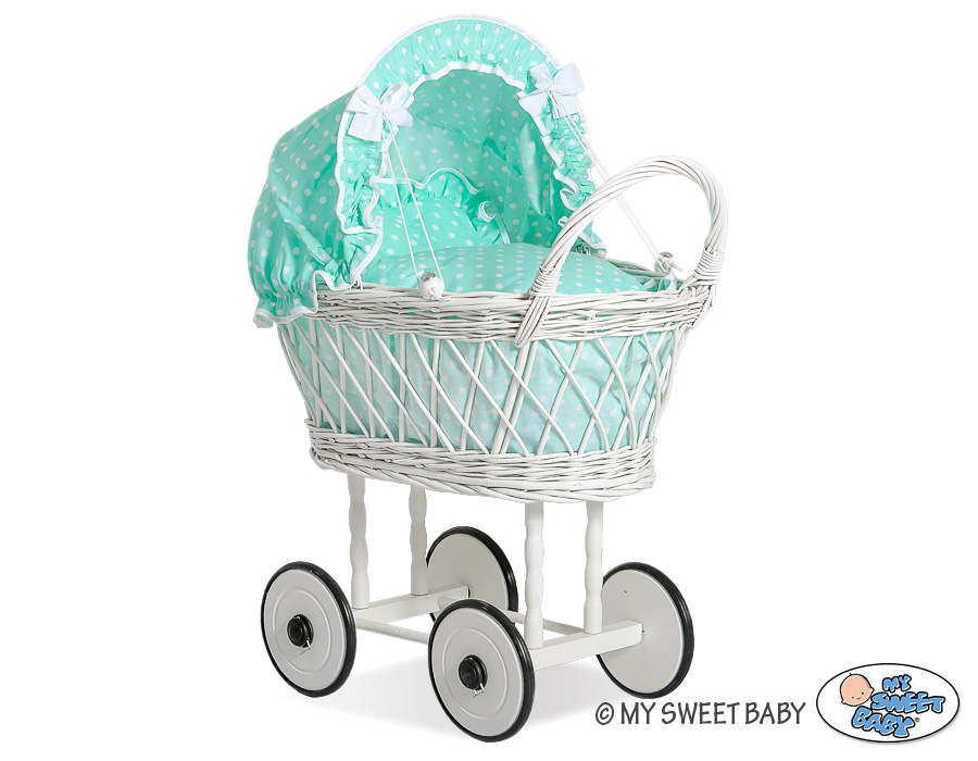 Valkoinen vaunu punotulla korilla nukelle