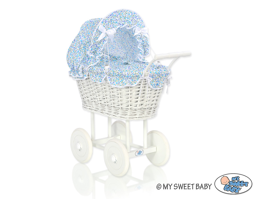 Etusivu » Lelut » Nukenvaunut » Punottu Nukenvaunut » Punottu Nukenvaunut Valkoinen » Valkoinen vaunu punotulla korilla nukelle Sininen Kukkaketo Kukat