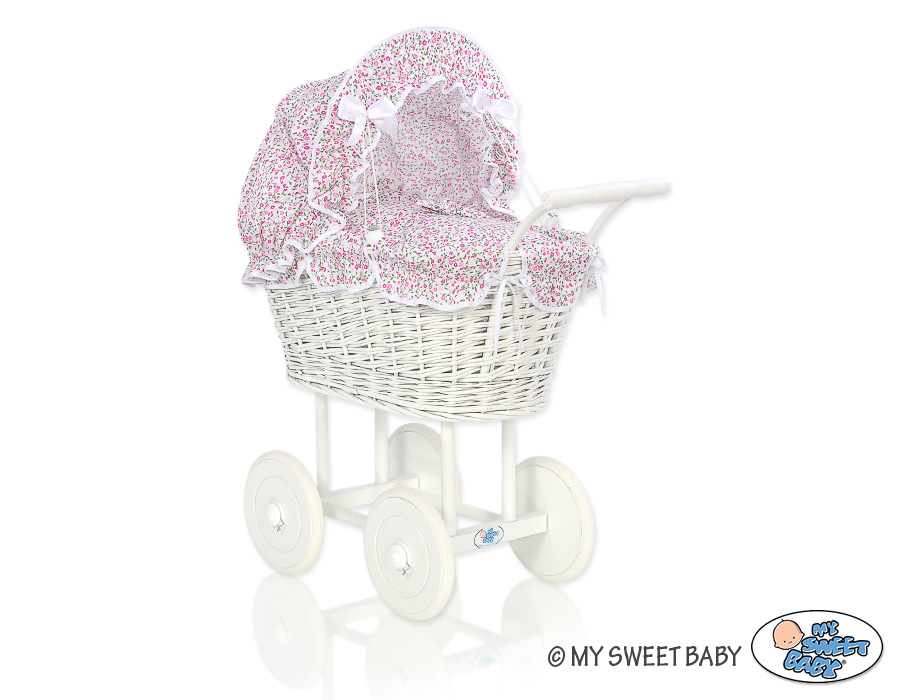 Etusivu » Lelut » Nukenvaunut » Punottu Nukenvaunut » Punottu Nukenvaunut Valkoinen » Valkoinen vaunu punotulla korilla nukelle Vaaleanpunainen Kukkaketo Kukat