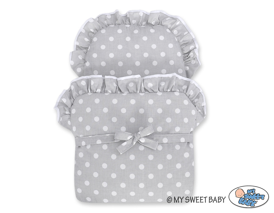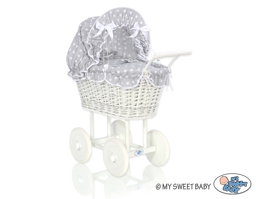 Valkoinen vaunu punotulla korilla nukelle Valkoinen Harmaa