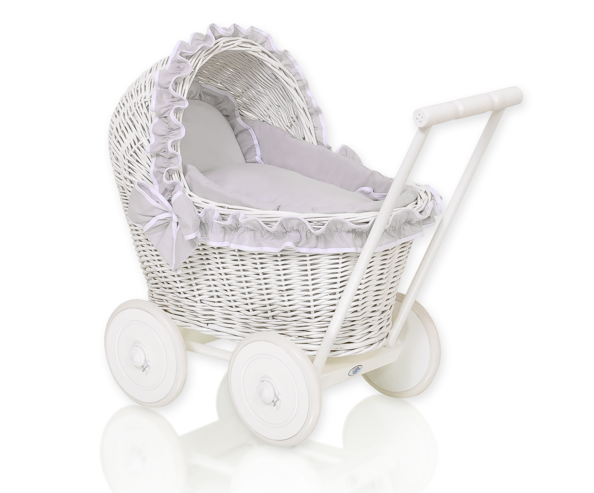 Etusivu » Lelut » Nukenvaunut » Punottu Nukenvaunut » Punottu Nukenvaunut Valkoinen » Valkoinen vaunu punotulla korilla nukelle Valkoinen Harmaa
