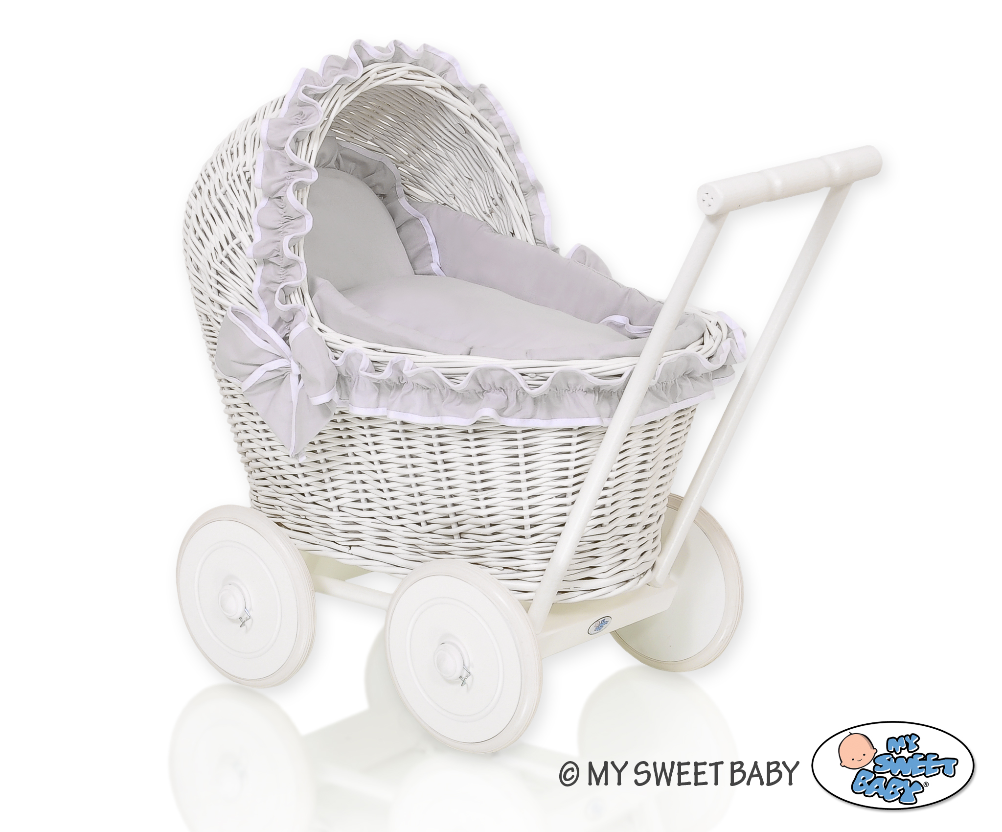 Valkoinen vaunu punotulla korilla nukelle Valkoinen Harmaa