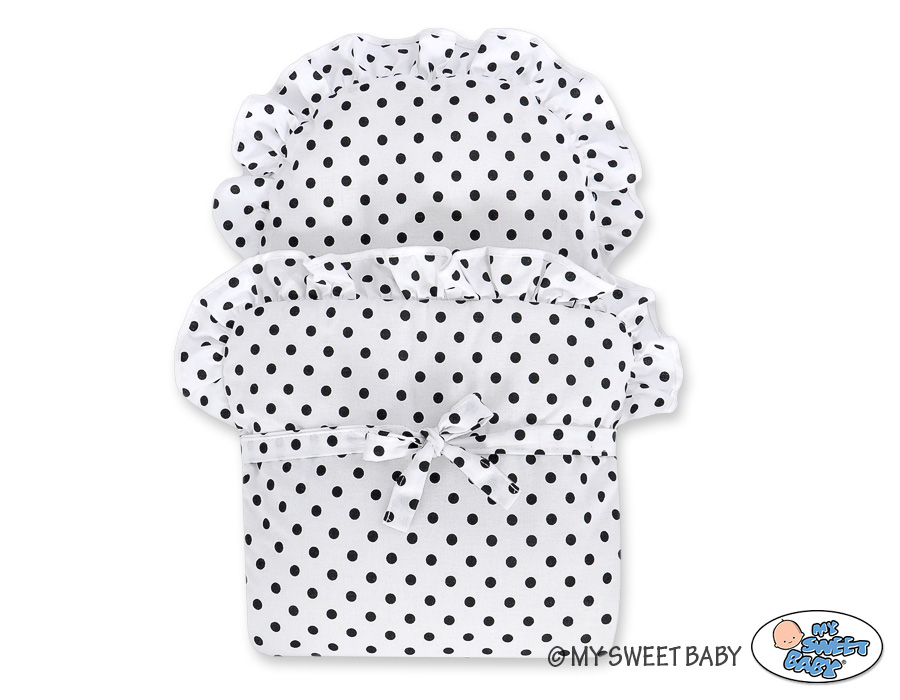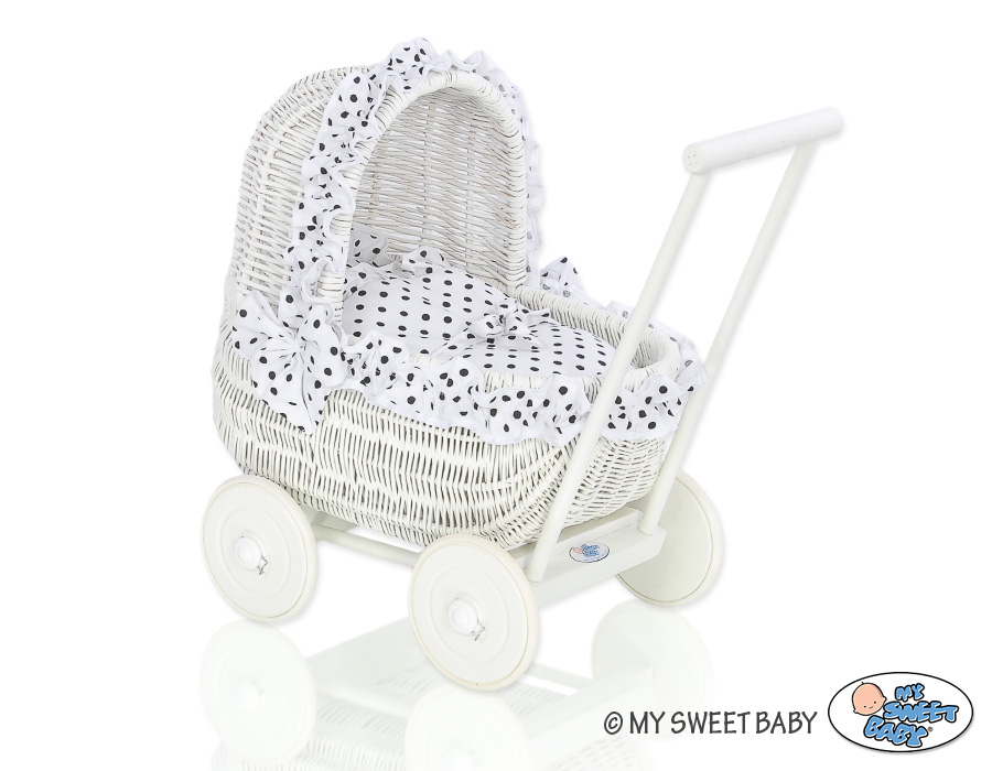 Valkoinen vaunu punotulla korilla nukelle Valkoinen Musta Valkoisilla Pilkuilla
