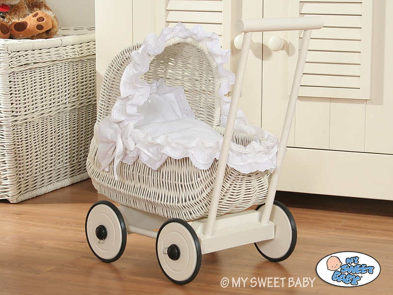 Etusivu » Lelut » Nukenvaunut » Punottu Nukenvaunut » Punottu Nukenvaunut Valkoinen » Valkoinen vaunu punotulla korilla nukelle Valkoinen
