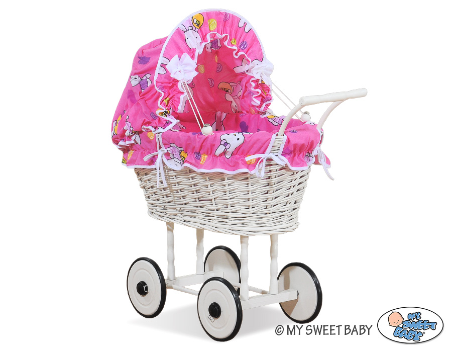 Etusivu » Lelut » Nukenvaunut » Punottu Nukenvaunut » Punottu Nukenvaunut Valkoinen » Valkoinen vaunu punotulla korilla nukelle Valkoinen