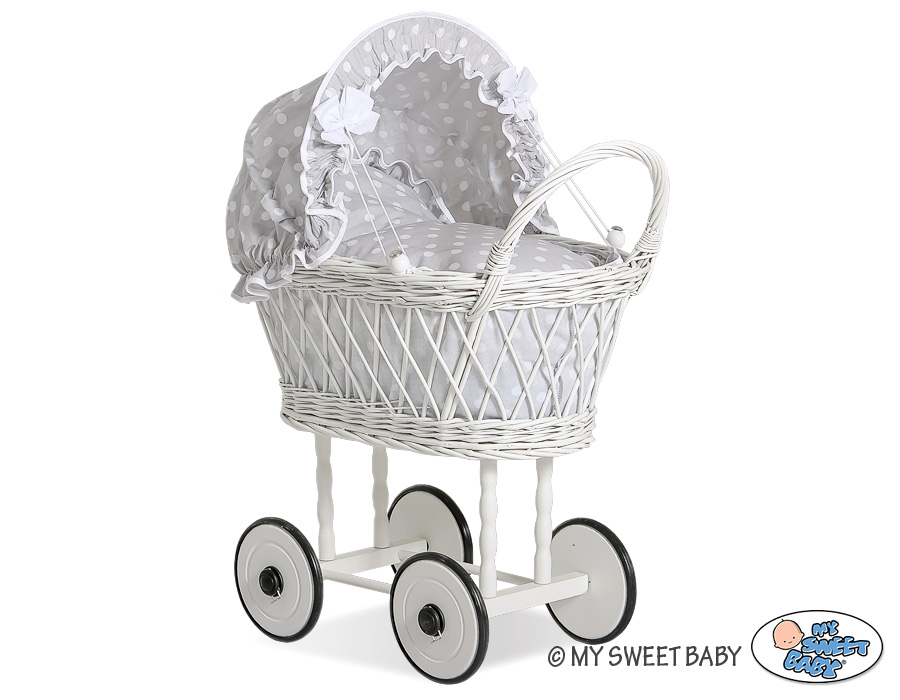 Etusivu » Lelut » Nukenvaunut » Punottu Nukenvaunut » Punottu Nukenvaunut Valkoinen » Valkoiset nuken vaunut punotulla korilla ja pehmusteilla Harmaa