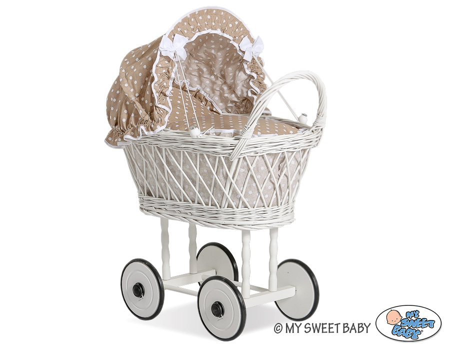 Etusivu » Lelut » Nukenvaunut » Punottu Nukenvaunut » Punottu Nukenvaunut Valkoinen » Valkoiset nuken vaunut punotulla korilla ja pehmusteilla