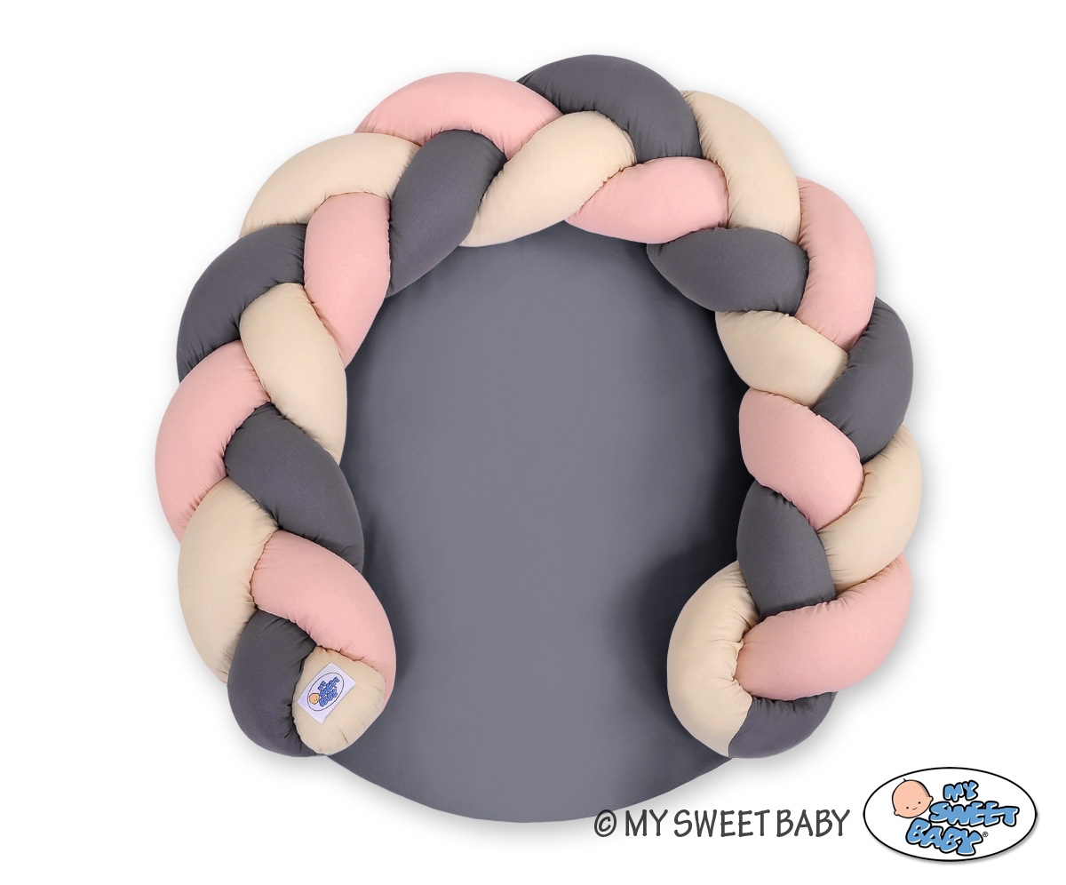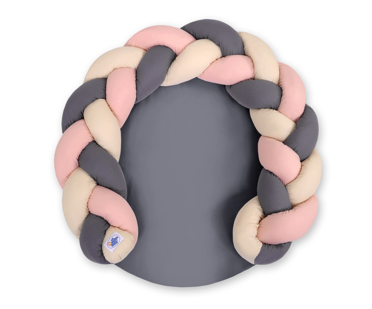 Monikäyttöinen letitetty donitsityyny vauvalle. Tyyny toimii kahdella tapaa; leikkimattona suojareunuksen kera tai sitten suojareunuksen saa irti ja liitettyä vauvan sänkyyn reunapehmusteeksi. Turvallinen leikkialusta vauvan ensihetkistä lähtien. Sopii vastasyntyneelle unipesäksi ja myöhemmin leikkialustaksi.