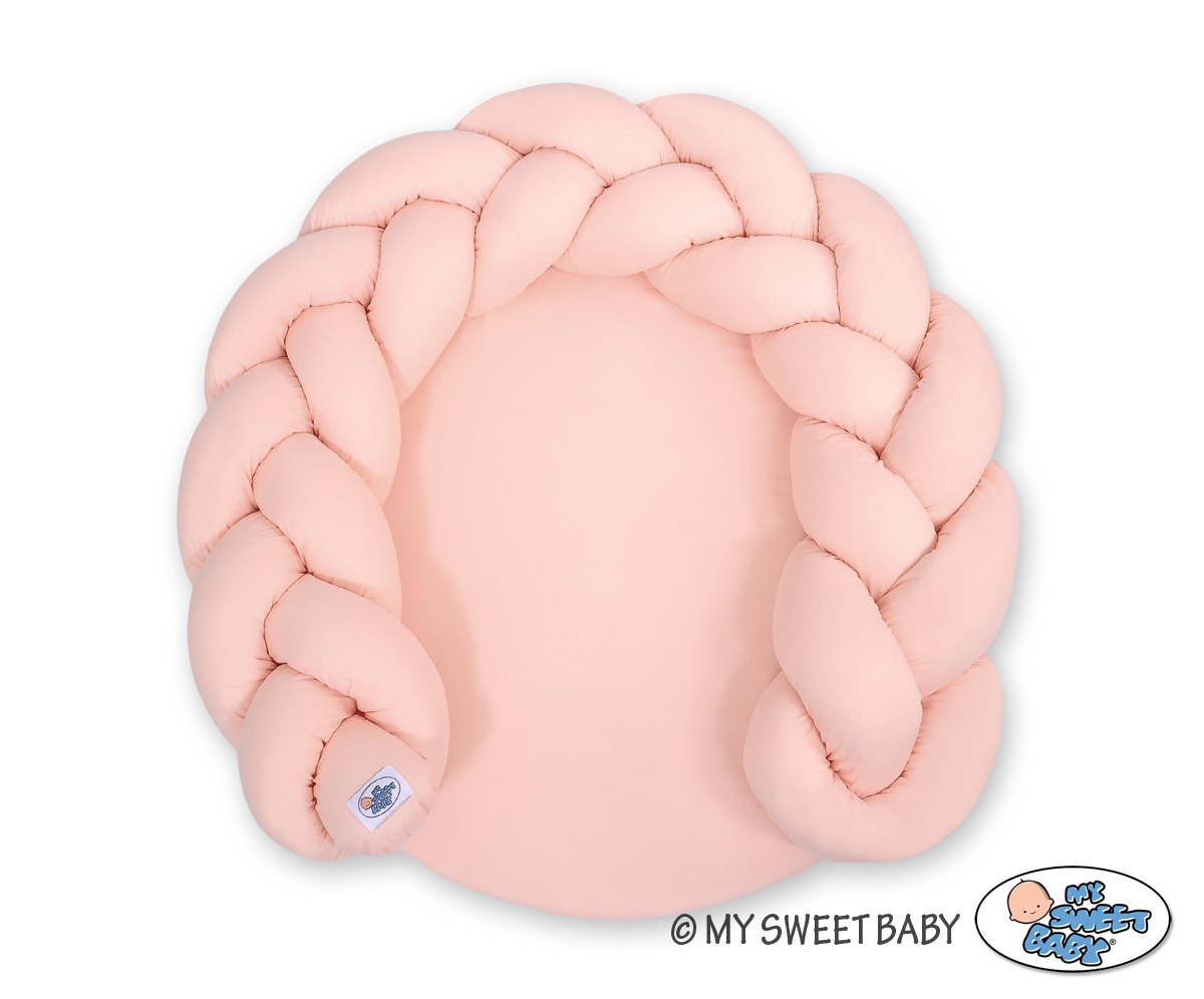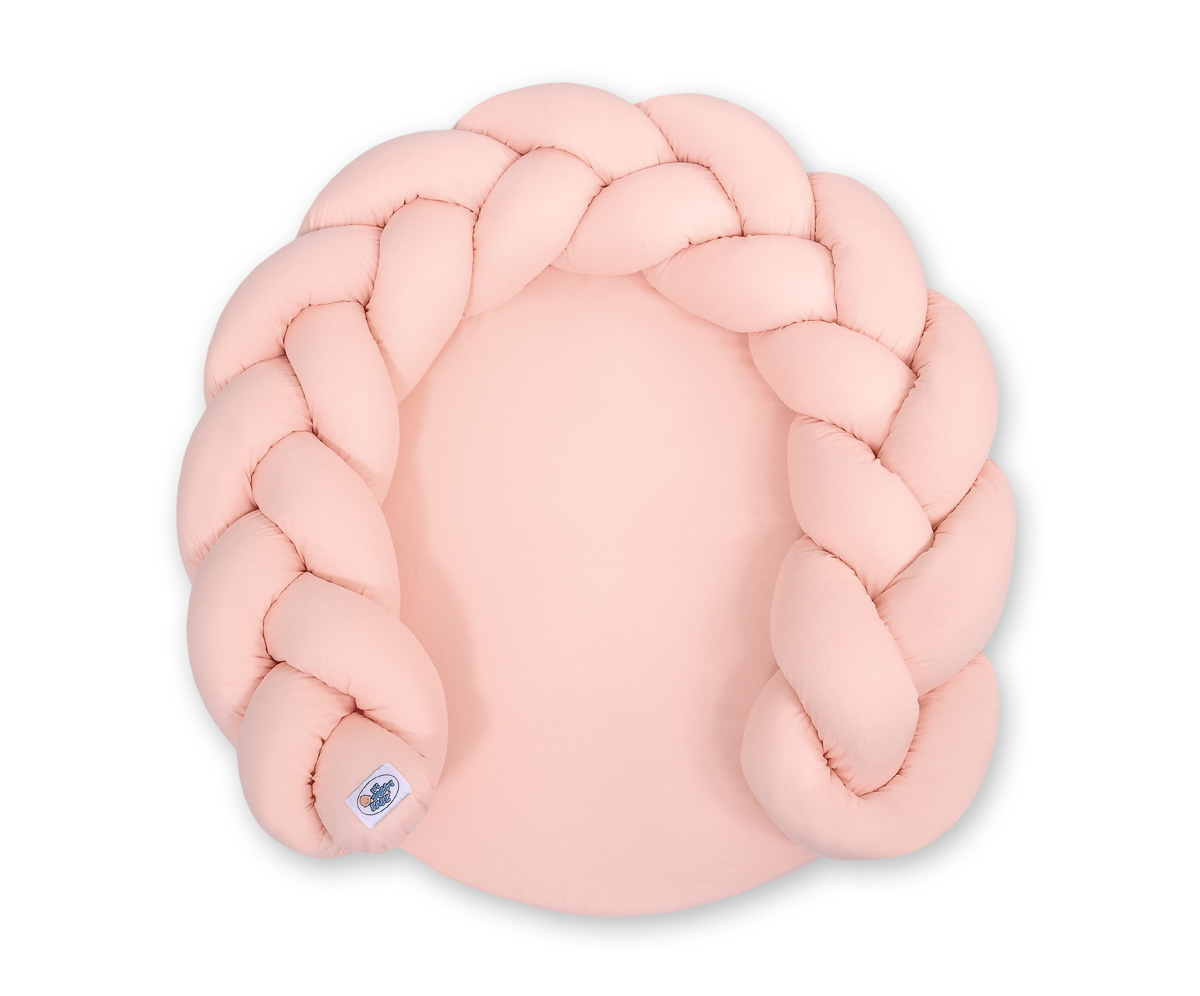 Monikäyttöinen letitetty donitsityyny vauvalle. Tyyny toimii kahdella tapaa; leikkimattona suojareunuksen kera tai sitten suojareunuksen saa irti ja liitettyä vauvan sänkyyn reunapehmusteeksi. Turvallinen leikkialusta vauvan ensihetkistä lähtien. Sopii vastasyntyneelle unipesäksi ja myöhemmin leikkialustaksi.