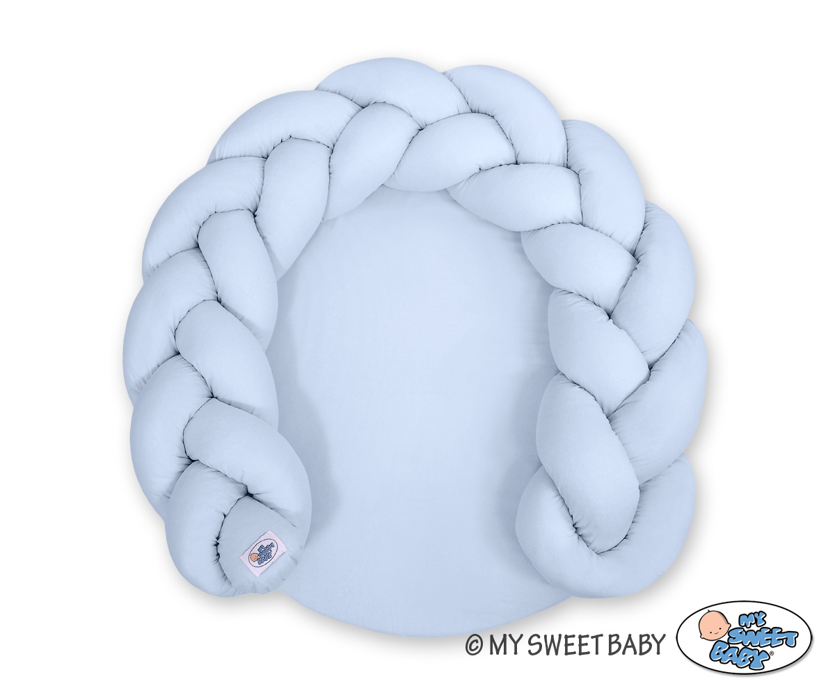 Monikäyttöinen letitetty donitsityyny vauvalle. Tyyny toimii kahdella tapaa; leikkimattona suojareunuksen kera tai sitten suojareunuksen saa irti ja liitettyä vauvan sänkyyn reunapehmusteeksi. Turvallinen leikkialusta vauvan ensihetkistä lähtien. Sopii vastasyntyneelle unipesäksi ja myöhemmin leikkialustaksi.