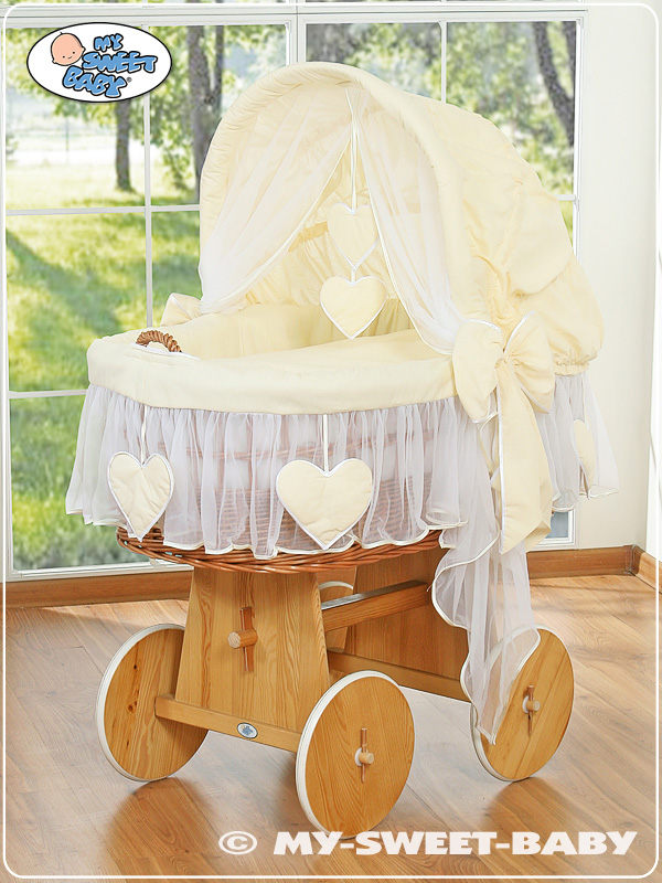 Kehdossa on kaunis ja autenttinen, tilava kori. Puuosat ja kori ihanan luonnollisen puun väriset.