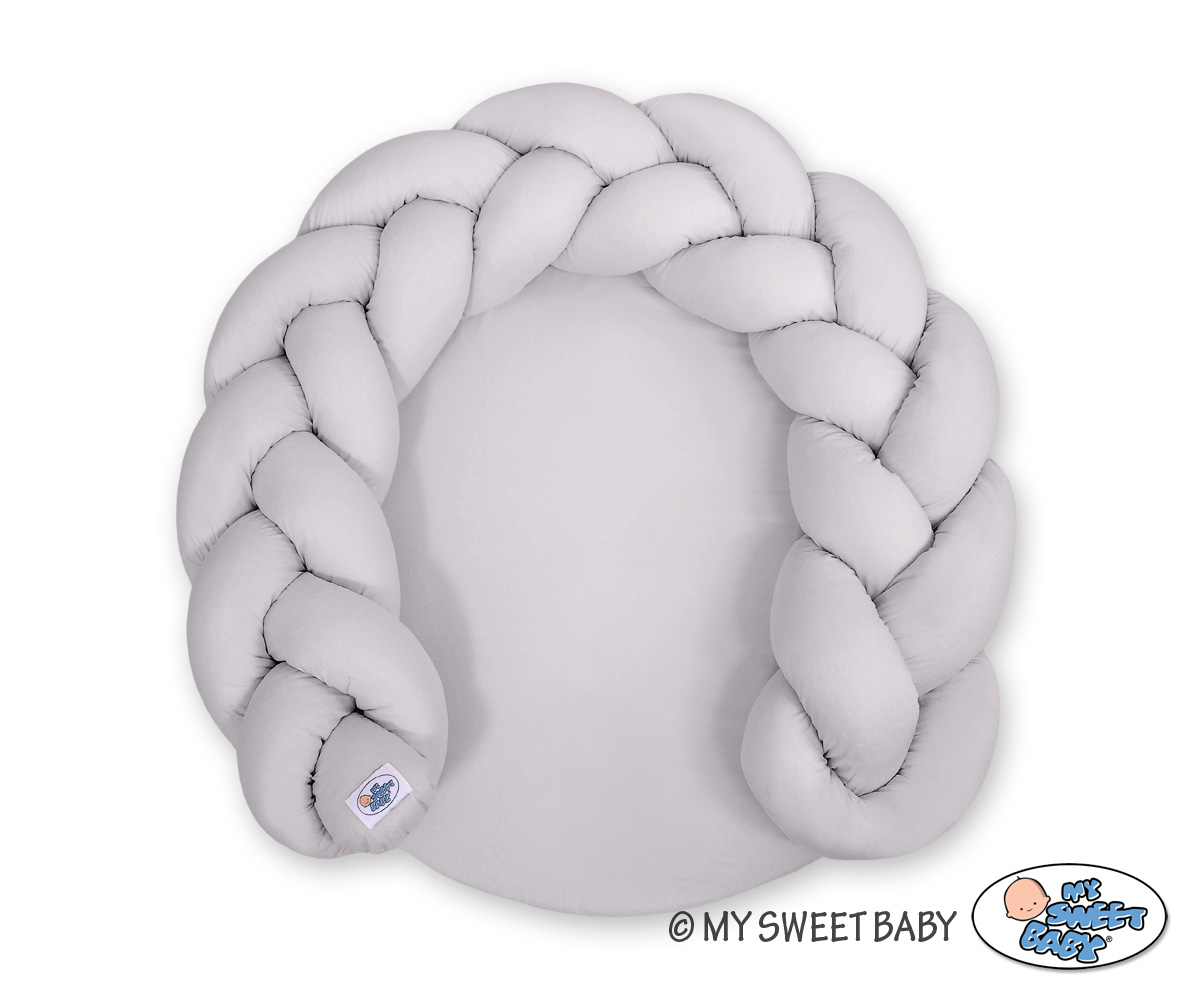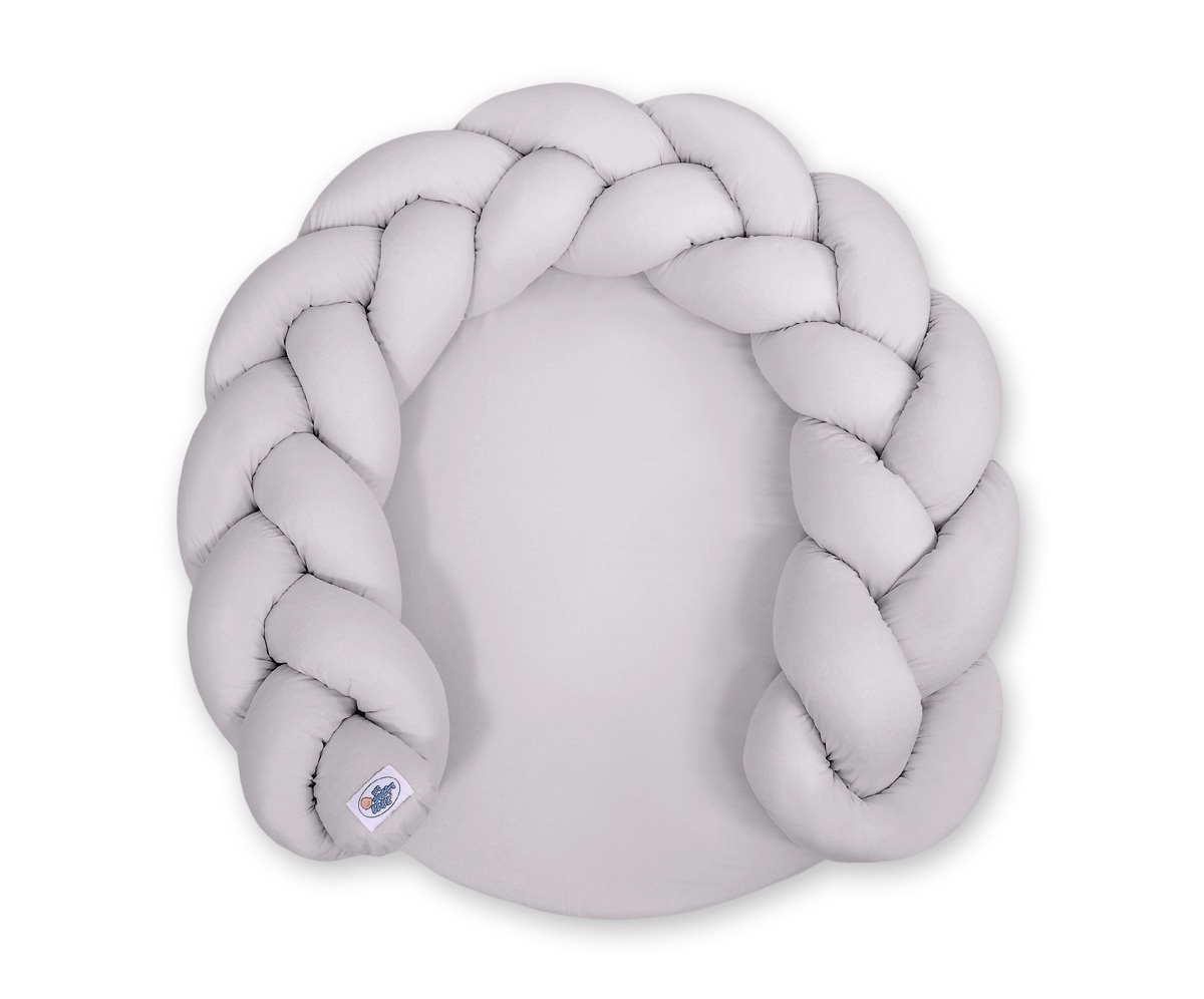 Monikäyttöinen letitetty donitsityyny vauvalle. Tyyny toimii kahdella tapaa; leikkimattona suojareunuksen kera tai sitten suojareunuksen saa irti ja liitettyä vauvan sänkyyn reunapehmusteeksi. Turvallinen leikkialusta vauvan ensihetkistä lähtien. Sopii vastasyntyneelle unipesäksi ja myöhemmin leikkialustaksi.