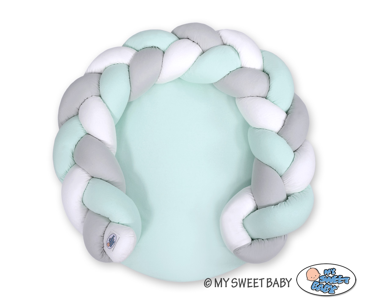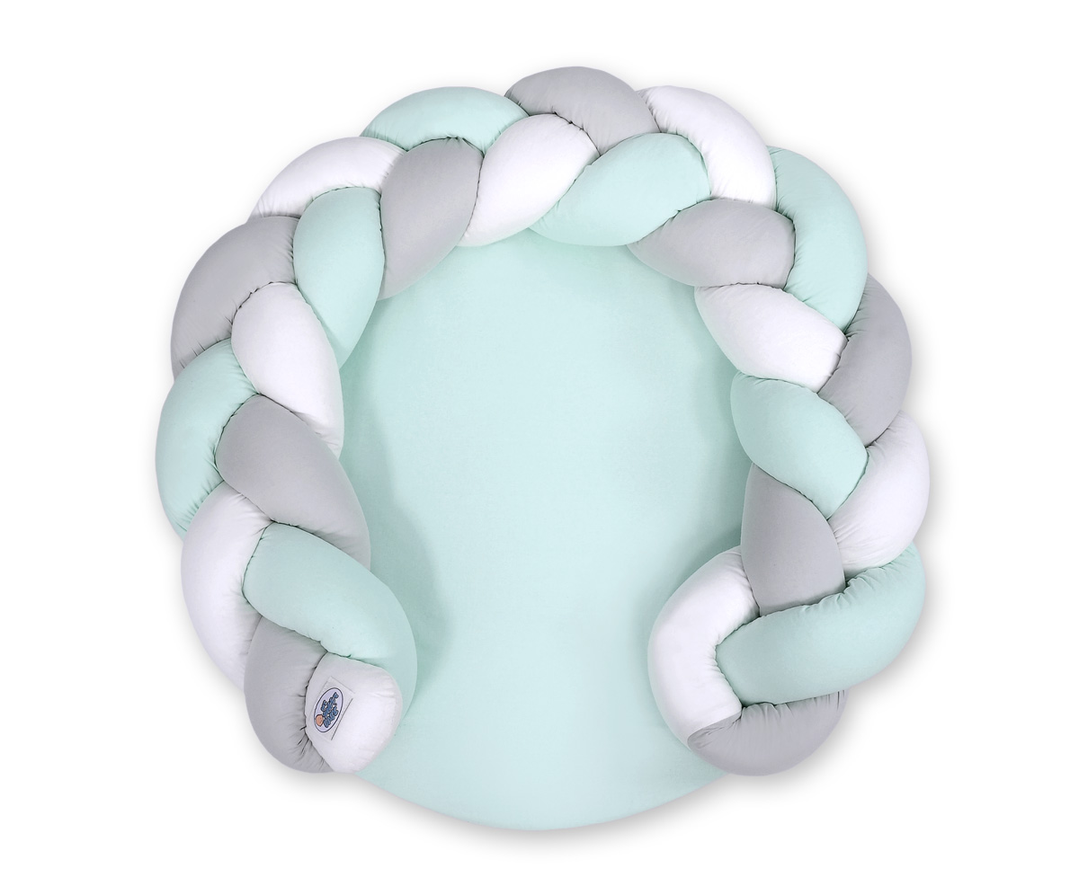 Monikäyttöinen letitetty donitsityyny vauvalle. Tyyny toimii kahdella tapaa; leikkimattona suojareunuksen kera tai sitten suojareunuksen saa irti ja liitettyä vauvan sänkyyn reunapehmusteeksi. Turvallinen leikkialusta vauvan ensihetkistä lähtien. Sopii vastasyntyneelle unipesäksi ja myöhemmin leikkialustaksi.