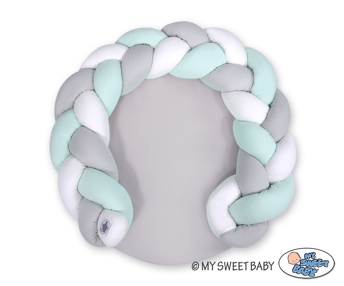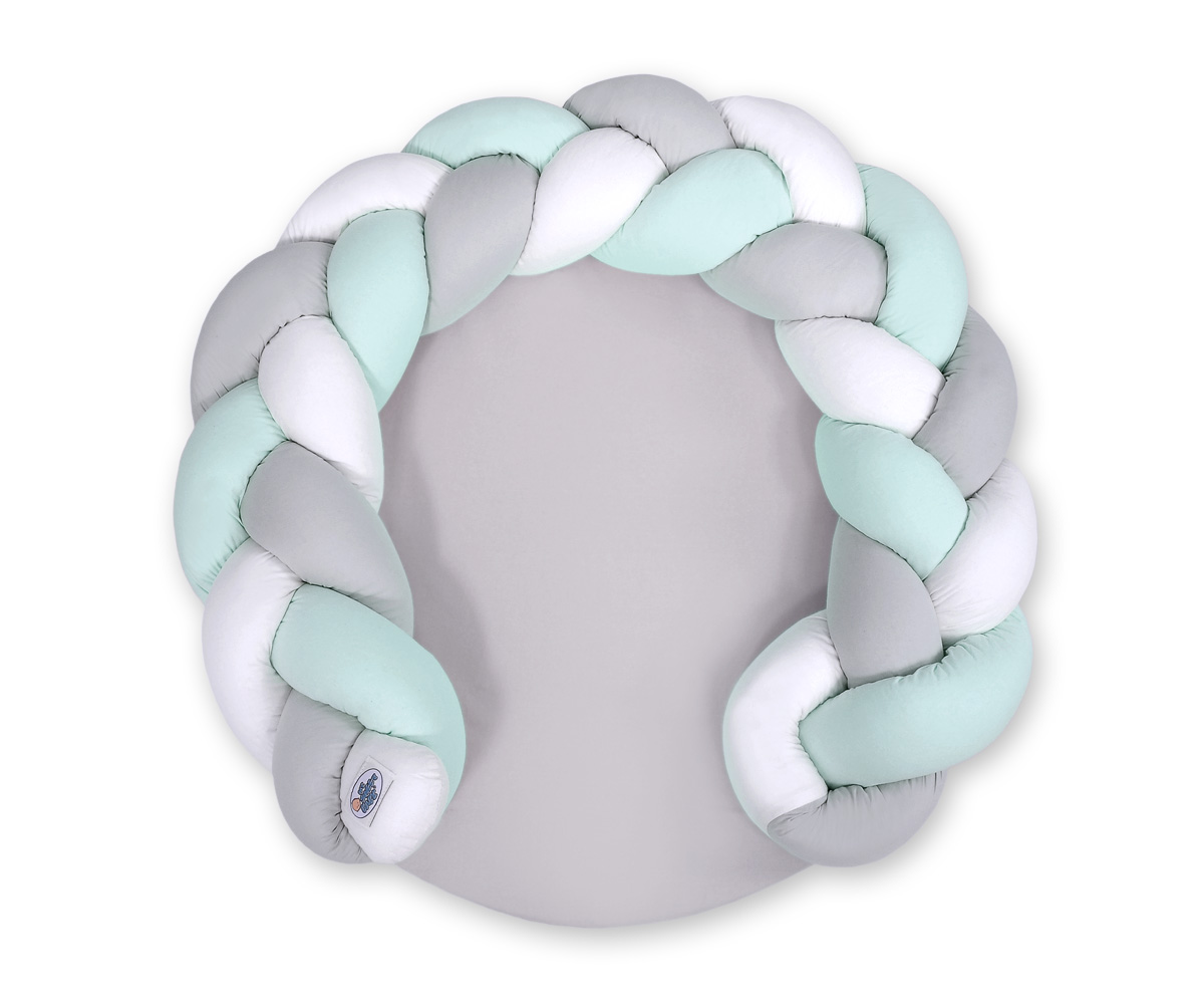 Monikäyttöinen letitetty donitsityyny vauvalle. Tyyny toimii kahdella tapaa; leikkimattona suojareunuksen kera tai sitten suojareunuksen saa irti ja liitettyä vauvan sänkyyn reunapehmusteeksi. Turvallinen leikkialusta vauvan ensihetkistä lähtien. Sopii vastasyntyneelle unipesäksi ja myöhemmin leikkialustaksi.