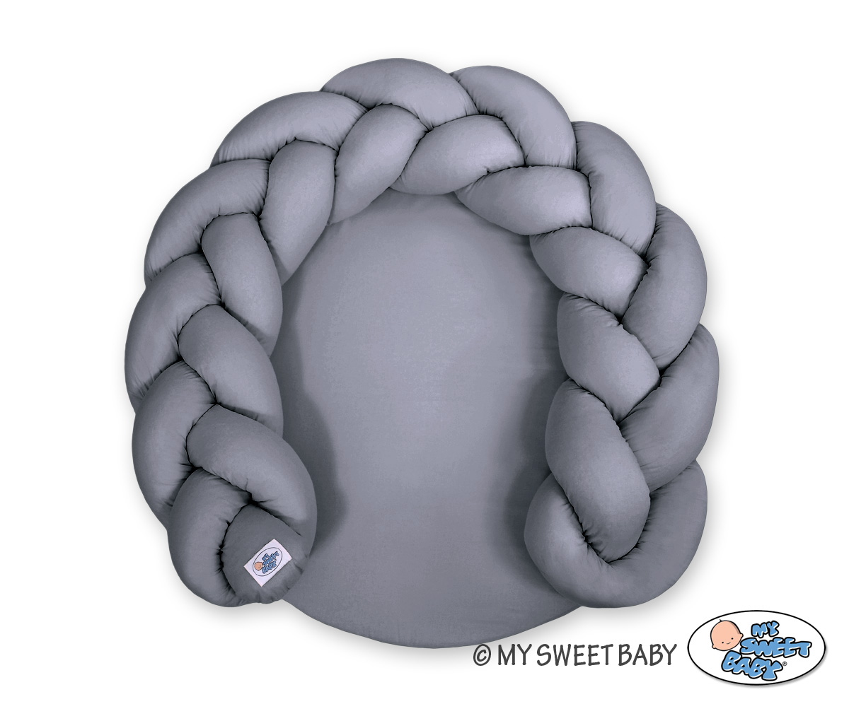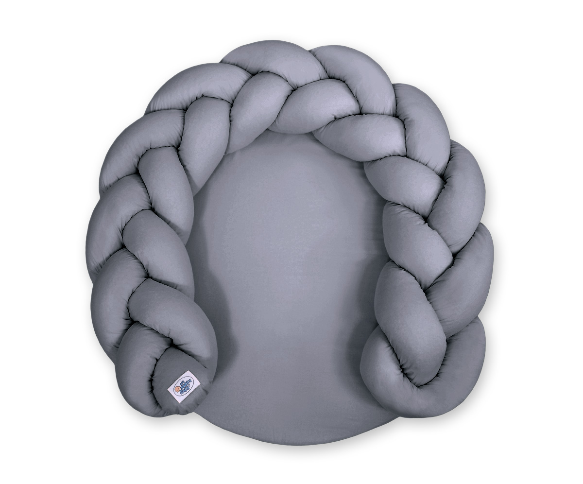 Monikäyttöinen letitetty donitsityyny vauvalle. Tyyny toimii kahdella tapaa; leikkimattona suojareunuksen kera tai sitten suojareunuksen saa irti ja liitettyä vauvan sänkyyn reunapehmusteeksi. Turvallinen leikkialusta vauvan ensihetkistä lähtien. Sopii vastasyntyneelle unipesäksi ja myöhemmin leikkialustaksi.