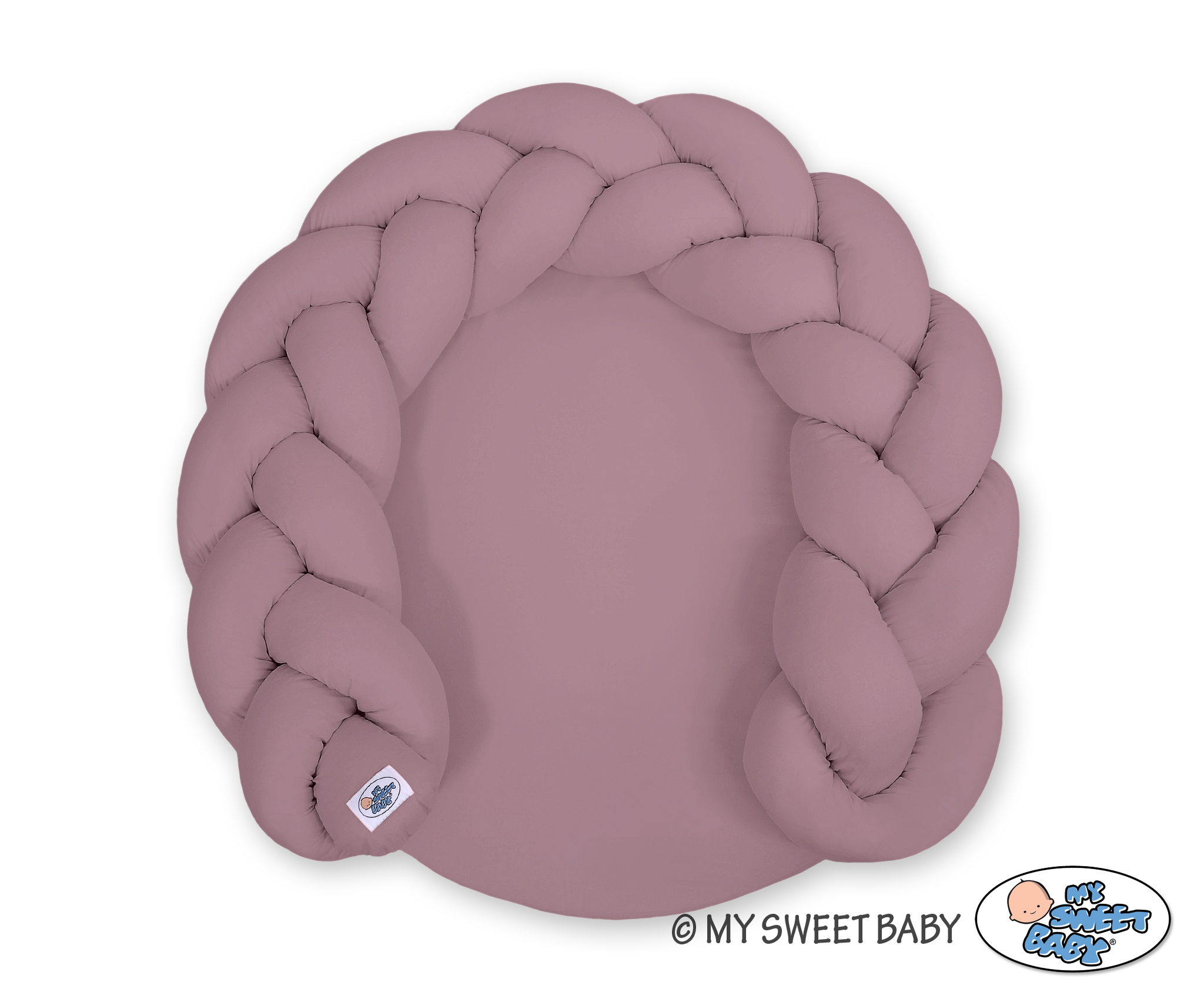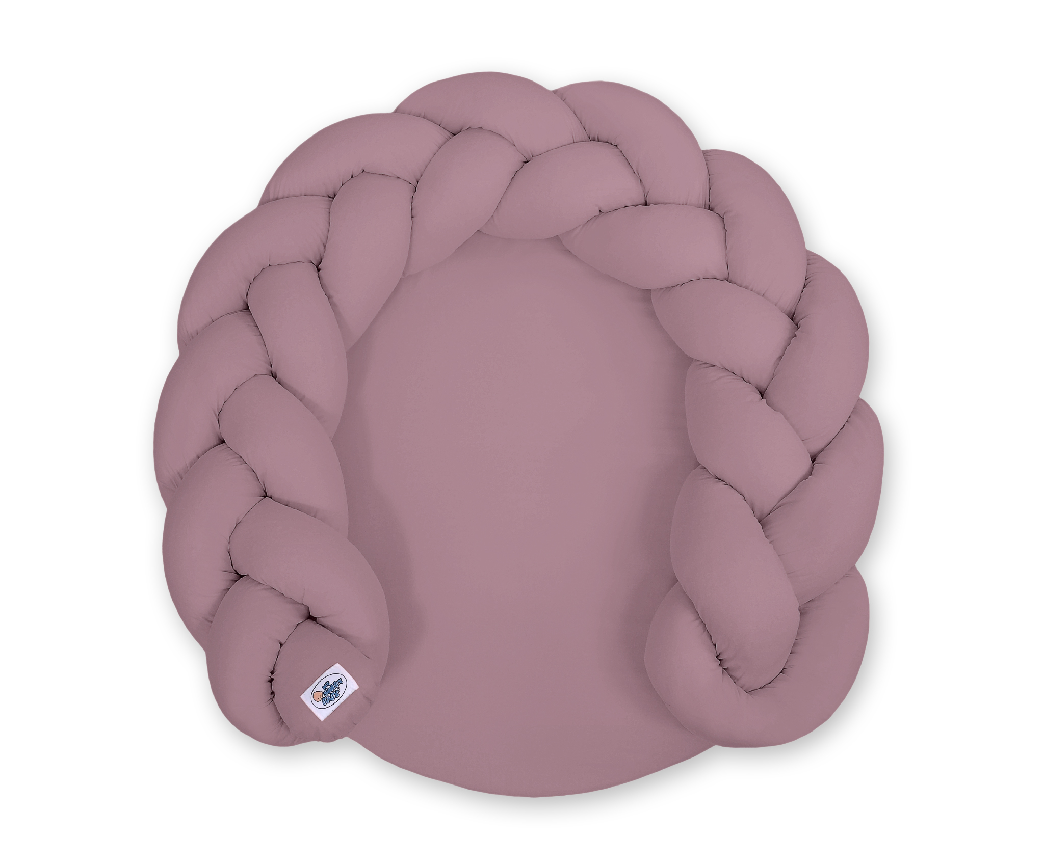 Monikäyttöinen letitetty donitsityyny vauvalle. Tyyny toimii kahdella tapaa; leikkimattona suojareunuksen kera tai sitten suojareunuksen saa irti ja liitettyä vauvan sänkyyn reunapehmusteeksi. Turvallinen leikkialusta vauvan ensihetkistä lähtien. Sopii vastasyntyneelle unipesäksi ja myöhemmin leikkialustaksi.