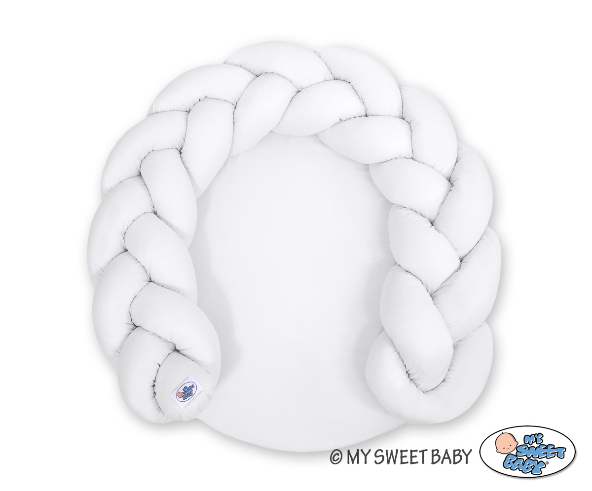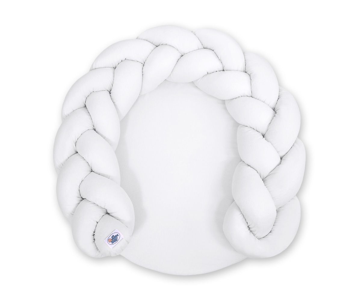 Monikäyttöinen letitetty donitsityyny vauvalle. Tyyny toimii kahdella tapaa; leikkimattona suojareunuksen kera tai sitten suojareunuksen saa irti ja liitettyä vauvan sänkyyn reunapehmusteeksi. Turvallinen leikkialusta vauvan ensihetkistä lähtien. Sopii vastasyntyneelle unipesäksi ja myöhemmin leikkialustaksi.