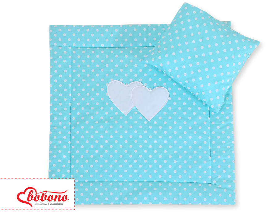 Etusivu » Vuodevaatesetit pinnasänkyyn » Vuodevaatesetit Sydämet » Vaunutekstiilisetti » Vuodevaatesetti vaunuihin - Hanging hearts Turkoosi Valkoisilla Pilkuilla